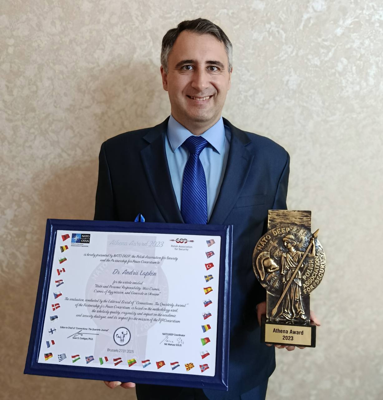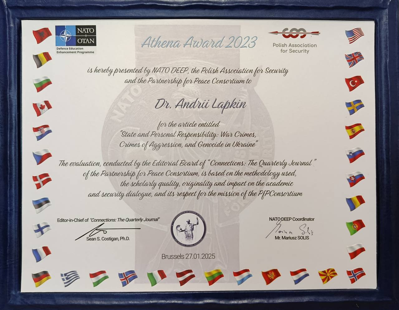 Наукову статтю доцента кафедри трудового права Університету Андрія Лапкіна на тему: «State and Personal Responsibility: War Crimes, Crimes of Aggression, and Genocide in Ukraine» було відзначено нагородою Connections Athena Award від Консорціуму оборонних академій та інститутів досліджень безпеки «Партнерство заради миру» (PfPC) як кращу статтю 2023 року.