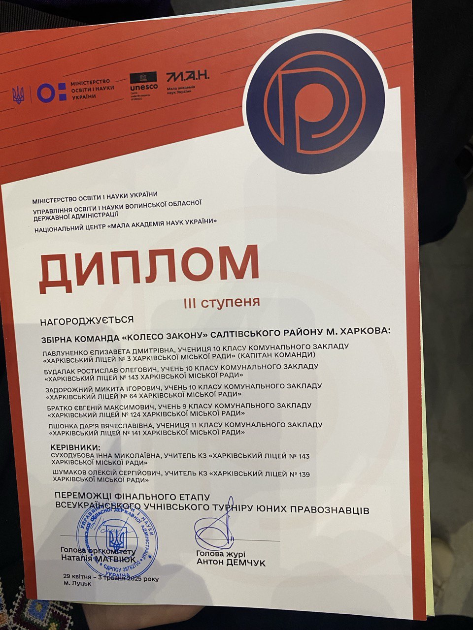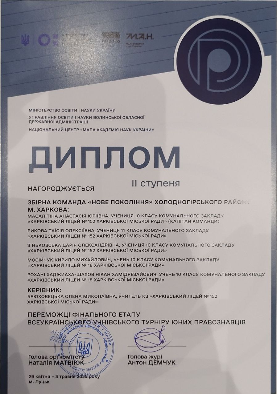 З 29 квітня по 3 травня 2025 року на базі Волинського національного університету імені Лесі Українки відбувся фінальний етап Всеукраїнського учнівського турніру юних правознавців. Цьогоріч у захопливій боротьбі інтелектів змагалися 22 команди ерудованих, амбітних, комунікабельних, здатних відстоювати власну думку учнів з різних регіонів України. Місто-герой Харків достойно представили 12 команд юних правознавців. Така кількість команд, які вийшли у фінал змагань вкотре засвідчує, що Харків – правнича столиця України.