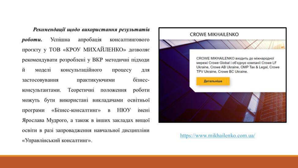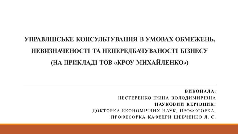 – «Управлінське консультування в умовах обмежень, невизначеності та непередбачуваності бізнесу» (І. В. Нестеренко),