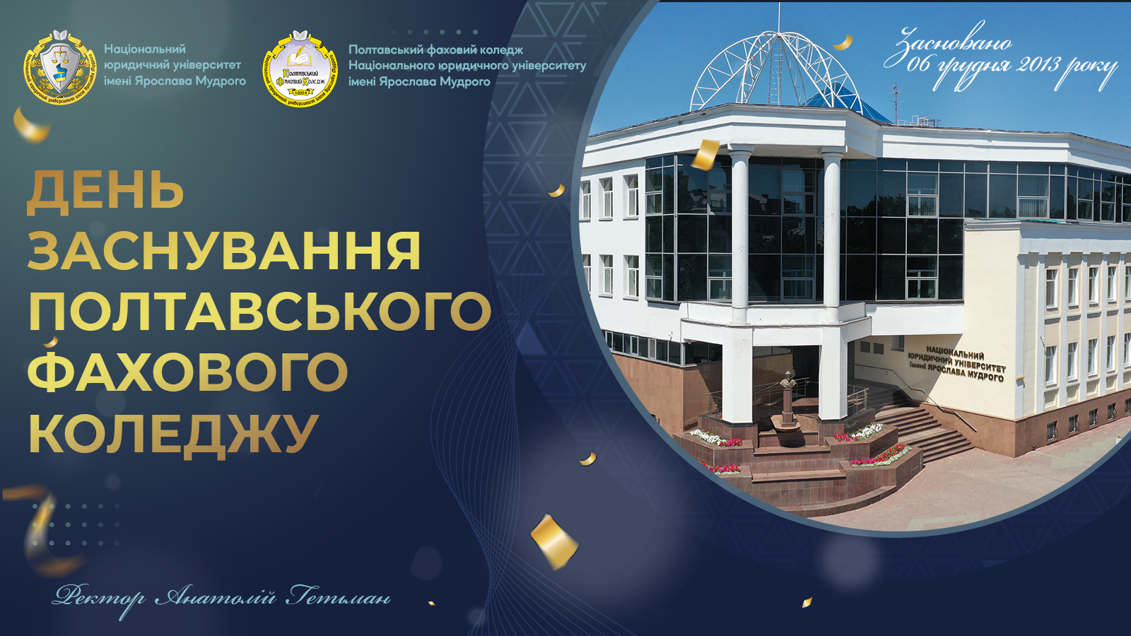 Саме 6 грудня 2013 року було покладено початок вашій історії, яка вже більш ніж десятиліття поспіль надихає, навчає та формує нову генерацію українських юристів. За цей порівняно невеликий, але надзвичайно насичений період, ваш заклад став справжнім осередком знань, другою домівкою для тисяч молодих людей та невіддільною частиною нашої великої освітньої родини. Ми — єдині у своїх прагненнях і спільно готуємо кваліфікованих фахівців у галузі права.