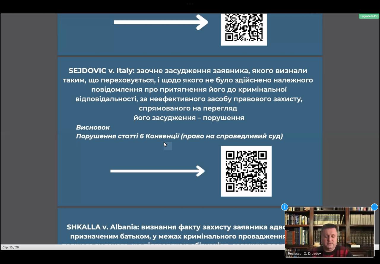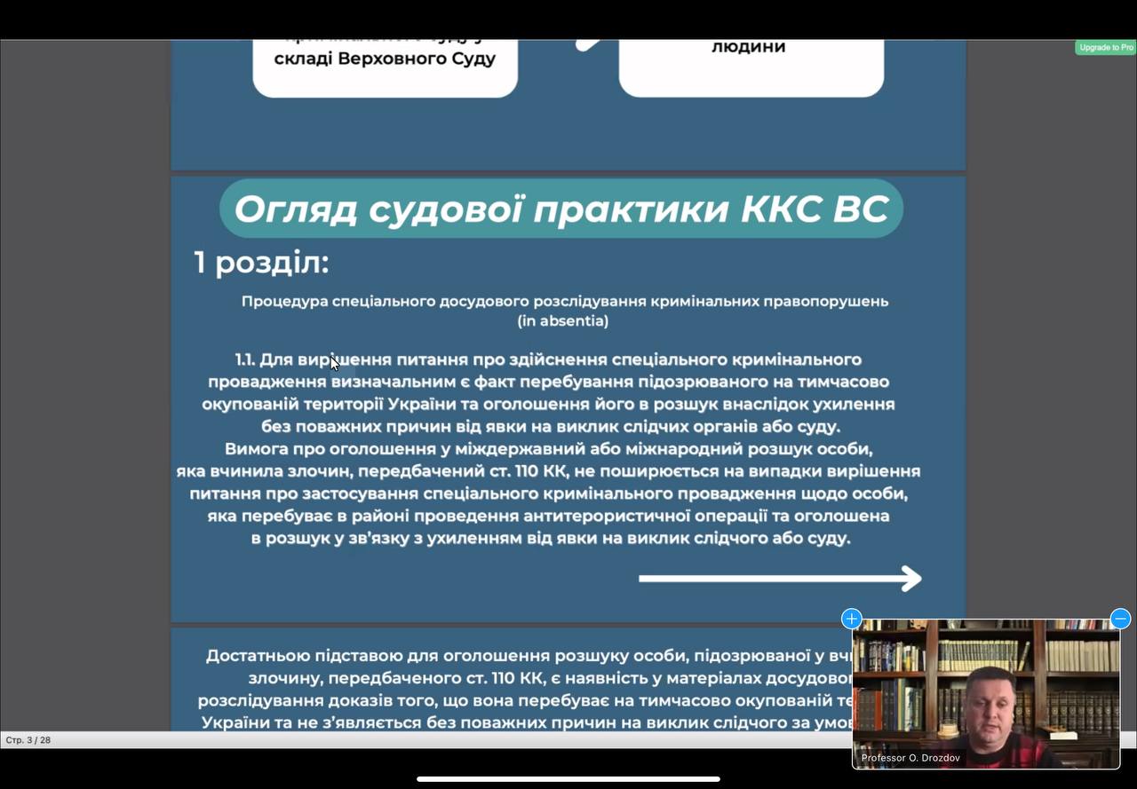 Доповідач проаналізував актуальну судову практику, окремо зосередивши увагу на практиці Касаційного кримінального суду у складі Верховного Суду щодо здійснення спеціальної процедури кримінального провадження (досудового розслідування та судового розгляду) за відсутності обвинуваченого (in absentia). Також професор Олександр ДРОЗДОВ досить детально висвітлив ключові рішення Європейського суду з прав людини щодо судового розгляду за відсутності обвинуваченого (in absentia).