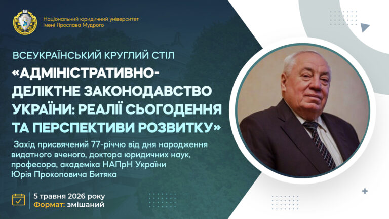 Запрошуємо науковців, викладачів, практиків та здобувачів вищої освіти взяти участь у роботі Всеукраїнського круглого столу. Захід присвячений 77-річчю від дня народження видатного вченого, доктора юридичних наук, професора, академіка НАПрН України Юрія Прокоповича Битяка. Дата та час: 🔹Дата проведення: 5 травня…