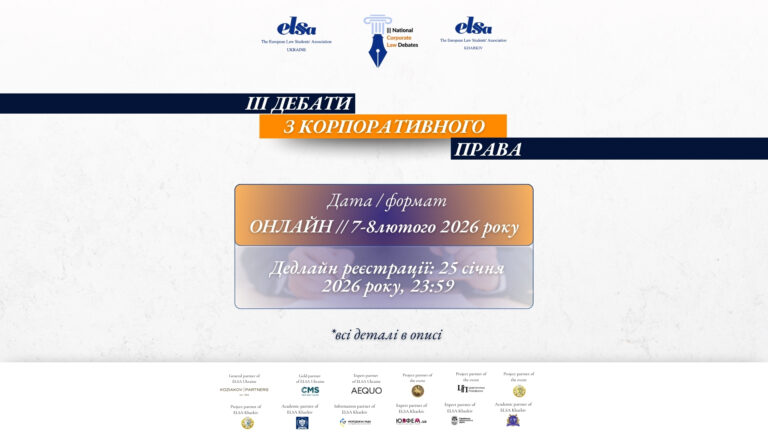 Люба мереже, вітаємо! ELSA Kharkiv відкриває реєстрацію на III Національні дебати з корпоративного права! Учасники: команди 2–3 осіб із числа студентів і курсантів I–VI курсів юридичних спеціальностей, а також молоді юристи (до 5 років після диплому). Формат: онлайн Дати:…
