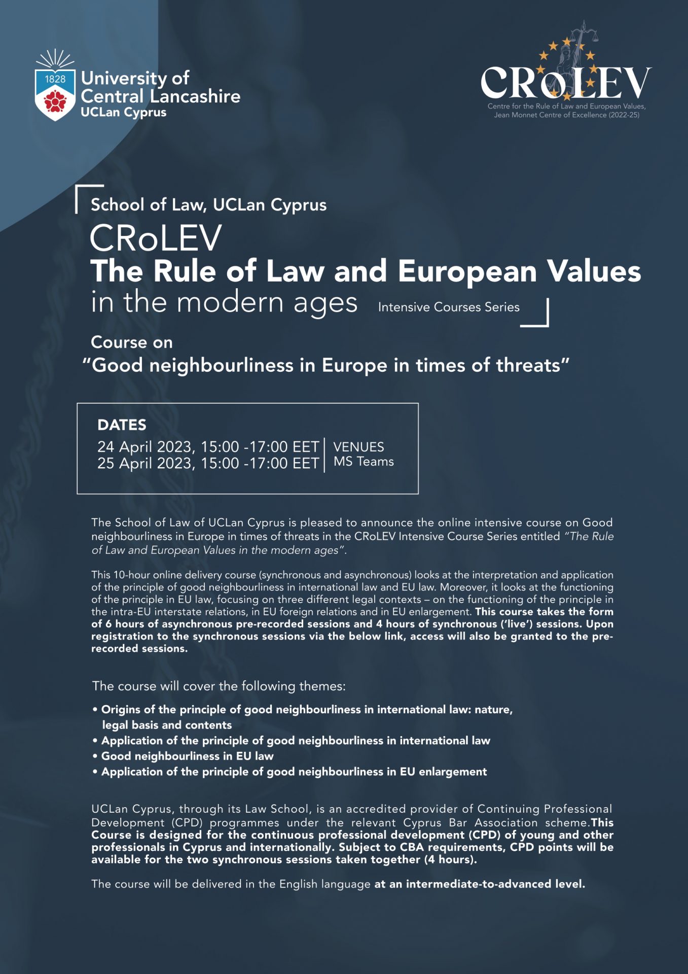 The School of Law of UCLan Cyprus is pleased to announce the online intensive course on Good neighbourliness in Europe in times of threats in the CRoLEV Intensive Course Series entitled “The Rule of Law and European Values in the modern ages”.