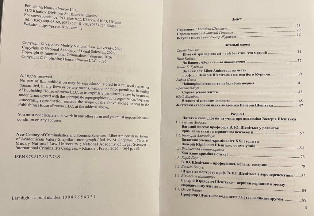Важливою складовою наукової події стала презентація колективної монографії «Нове століття криміналістики та судових наук. Liber Amicorum на честь академіка Валерія Шепітька». Видання підготовлене 92 авторами з різних країн світу — представниками провідних наукових і освітніх установ України та Європи, серед яких: Національна академія правових наук України, Національний юридичний університет імені Ярослава Мудрого, Національний університет «Одеська юридична академія», Національна академія внутрішніх справ, юридичний факультет Ужгородського національного університету, Національний науковий центр «Інститут судових експертиз імені Заслуженого професора М. С. Бокаріуса», Polskie Towarzystwo Kryminalistyczne, Lietuvos Kriminalistų Draugija та інші освітні та наукові установи.
