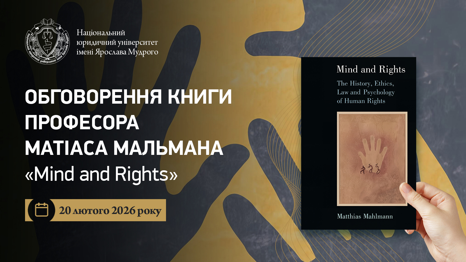 Запрошуємо до участі в оговоренні книги професора Матіаса Мальмана «Mind and Rights», яке відбудеться 20 лютого. Професор Матіас Мальман (Університет Цюриха, Швейцарія) виступить із доповіддю, у якій окреслить свою концепцію прав людини, викладену у його книзі «Mind and Rights» і поміркує над становищем прав людини в контексті сучасної кризи нормативності в цілому і кризи міжнародного права зокрема.