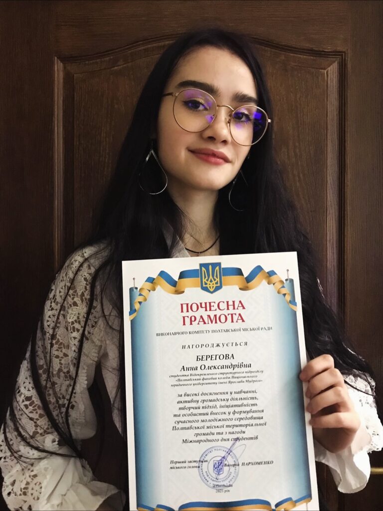 — Анну Берегову, студентку Полтавського фахового коледжу НЮУ імені Ярослава Мудрого.