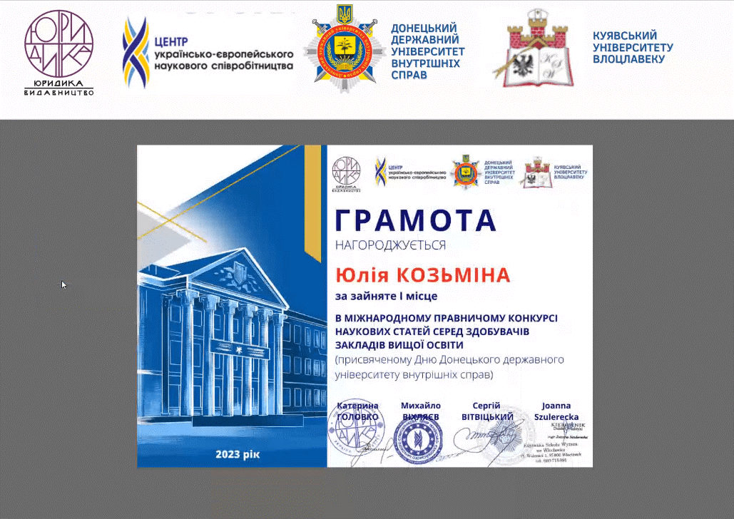 За підсумками Міжнародного правничого конкурсу наукових статей серед здобувачів вищої освіти закладів вищої освіти (присвяченого дню Донецького державного університету внутрішніх справ), студентка національного юридичного університету імені Ярослава Мудрого Юлія Козьміна стала його переможницею.