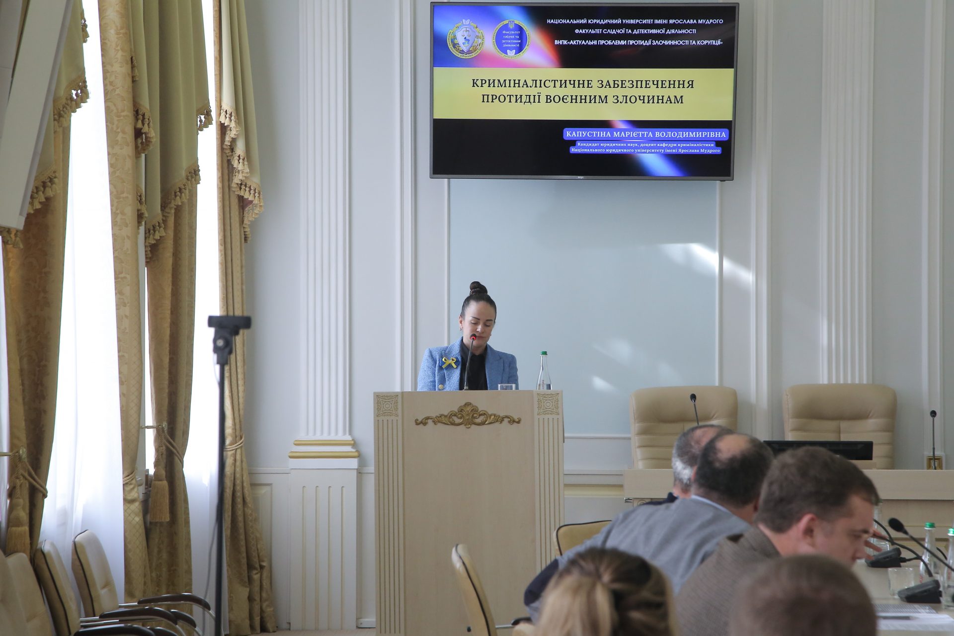 Також з доповідями на конференції виступили Завідувач кафедри кримінально-правової політики Національного юридичного університету імені Ярослава Мудрого, доктор юридичних наук, професор Сергій ХАРИТОНОВ за темою «Щодо деяких питань удосконалення воєнного законодавства в контексті відповідальності за військові кримінальні правопорушення», кандидат юридичних наук, доцент кафедри криміналістики Національного юридичного університету імені Ярослава Мудрого Марієтта КАПУСТІНА «Криміналістичне забезпечення протидії воєнним злочинам», аспірант кафедри кримінальної юстиції Національного юридичного університету імені Ярослава Мудрого Віктор НОВОЖИЛОВ «Кримінальні процесуальні засоби попередження вторинної віктимізації осіб, які постраждали від військової агресії».