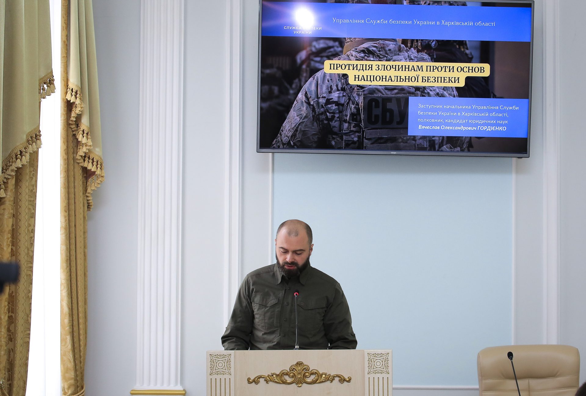 Заступник начальника Управління Служби безпеки України в Харківській області, полковник, кандидат юридичних наук Вячеслав ГОРДІЄНКО в доповіді «Протидія злочинам проти основ національної безпеки» зазначив, що захопивши частину території Харківської області, загарбники намагались установити над нею свій контроль та інтегрувати до державної, економічної, фінансової та соціальної структури російської федерації. З цією метою вони створили окупаційні адміністрації та різноманітні незаконні органи влади та управління. На тимчасово окупованій території росіяни прагнули знищити українську ідентичність населення, тому вдавалися до знищення української освіти та запровадження російських освітніх стандартів. Окрім колаборантів, Управлінням виявлено низку осіб, які тим чи іншим шляхом надавали допомогу державі-агресору, її збройним формуванням або окупаційній адміністрації.