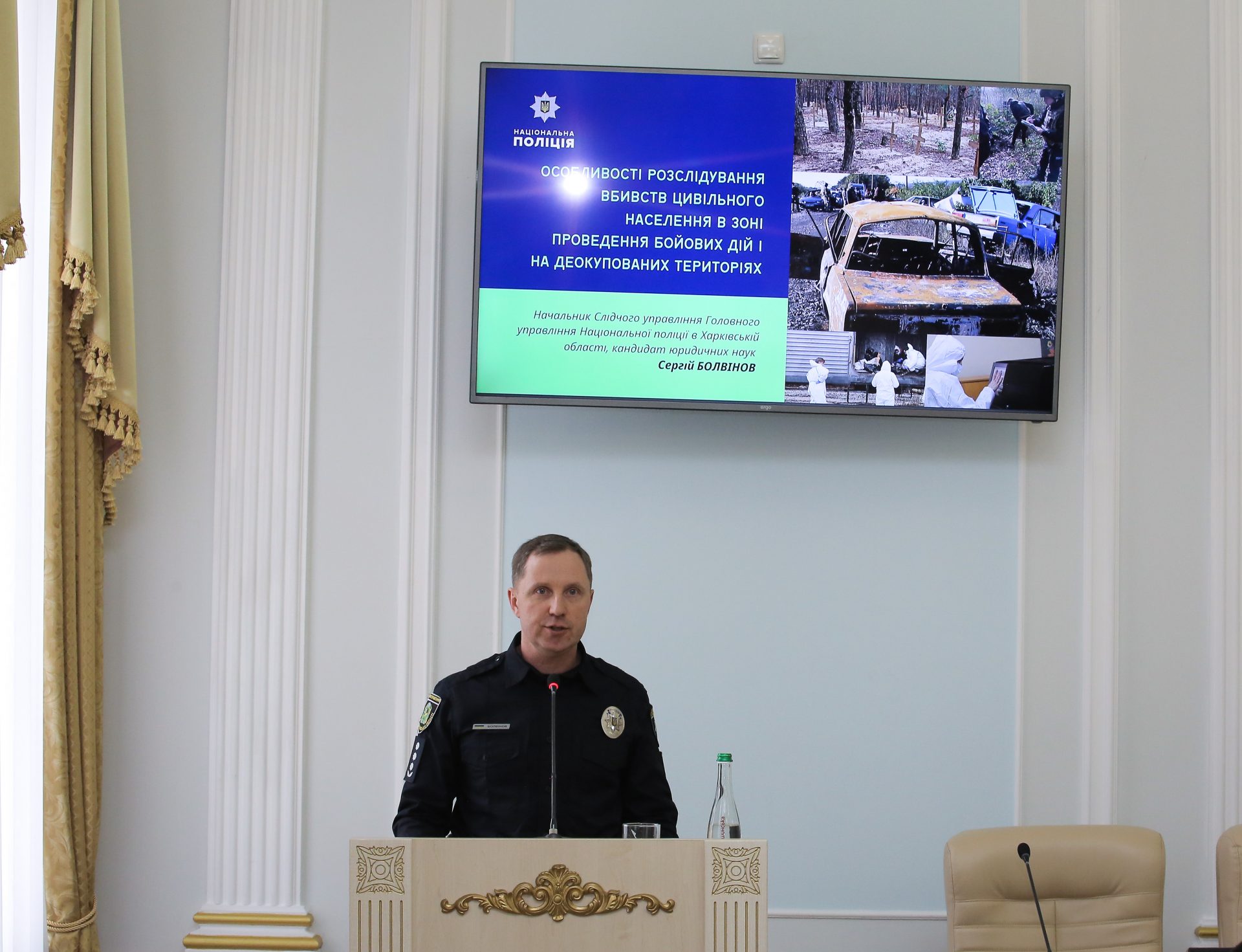 Начальник Слідчого управління Головного управління поліції в Харківській області Сергій БОЛВІНОВ в доповіді «Особливості розслідування вбивств цивільного населення в зоні проведення бойових дій і на деокупованих територіях» зазначив, що станом на 01.02.2023 в Харківській області внаслідок бойових дій загинуло 1760 цивільних громадян, з них 74 дитини; поранено – 2650 цивільних осіб. З початку вересня 2022 р. на деокупованих територіях Харківської області слідством поліції виявлено 738 загиблих цивільних громадян із них 639 вже ідентифіковано, однак 99 залишаються невпізнаними. Серед особливостей розслідування вбивств цивільного населення під час проведення бойових дій є те, що місце роботи слідчих та криміналістів наближене до лінії зіткнення та піддається постійним щільним обстрілам; місце проведення огляду у більшості випадків заміновано, тому обов’язково підлягає розмінуванню; через тривале перебування населених пунктів в яких вчинені вбивства цивільних під окупацією відсутня можливість вилучення слідової інформації, втрачається значна частина речових доказів; огляд трупу, ідентифікація особи та встановлення причин смерті ускладняється внаслідок не проведення попередньої експертизи СМЕ, поховання загиблого через значний проміжок часу після смерті, намагання злочинцями та окупантами приховати сліди катувань тощо.