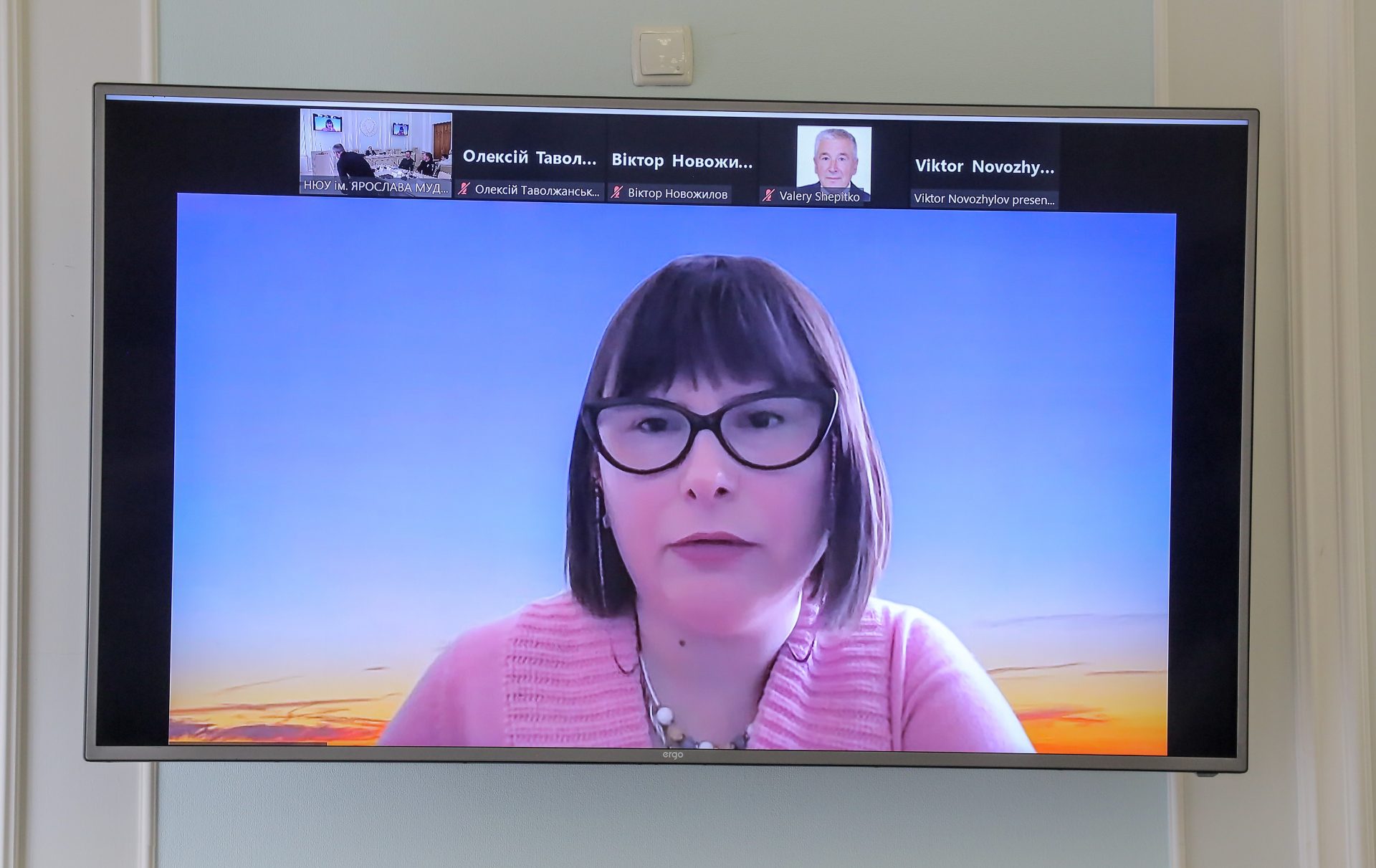 Завідувач кафедри кримінального права Національного юридичного університету імені Ярослава Мудрого, доктор юридичних наук, доцент Юрій ПОНОМАРЕНКО у своїй доповіді порушив питання про виклики, які поставила перед кримінальним правом України широкомасштабна фаза російської збройної агресії проти України, та відповіді, які на них має дати вітчизняне кримінальне законодавство. Коротко зупинившись на огляді й оцінці тих відповідей, які дані чи мали б бути дані у чинному КК України, далі він перейшов до викладу відповідних положень проєкту нового КК України, в розробці якого доповідач бере участь як член робочої групи з питань розвитку кримінального права Комісії з питань правової реформи при Президентові України. Зокрема, було звернуто увагу на новелізацію в проєкті приписів про кримінальну відповідальність за злочини проти основ національної безпеки України (оновлені склади державної зради і колабораційної діяльності, новий склад окупаційної діяльності тощо); повну імплементацію кримінально-правових положень Римського Статуту МКС (про склади злочину геноциду, злочину агресії, воєнних злочинів і злочинів проти людяності та їхню караність); на оновлену систему кримінально-правових засобів, що підлягають застосуванню під час воєнного стану, у тому числі – на нові підстави звільнення від кримінальної відповідальності або від покарання осіб, які виявили бажання взяти участь у захисті України тощо.