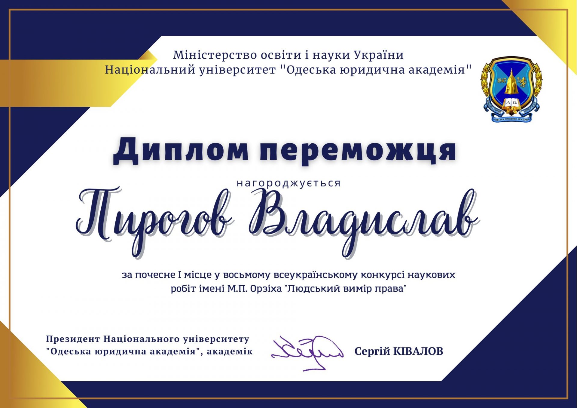 Аспірант Університету Владислав Пирогов став переможцем Восьмого всеукраїнського конкурсу наукових робіт імені Марка Пилиповича Орзіха «Людський вимір права»