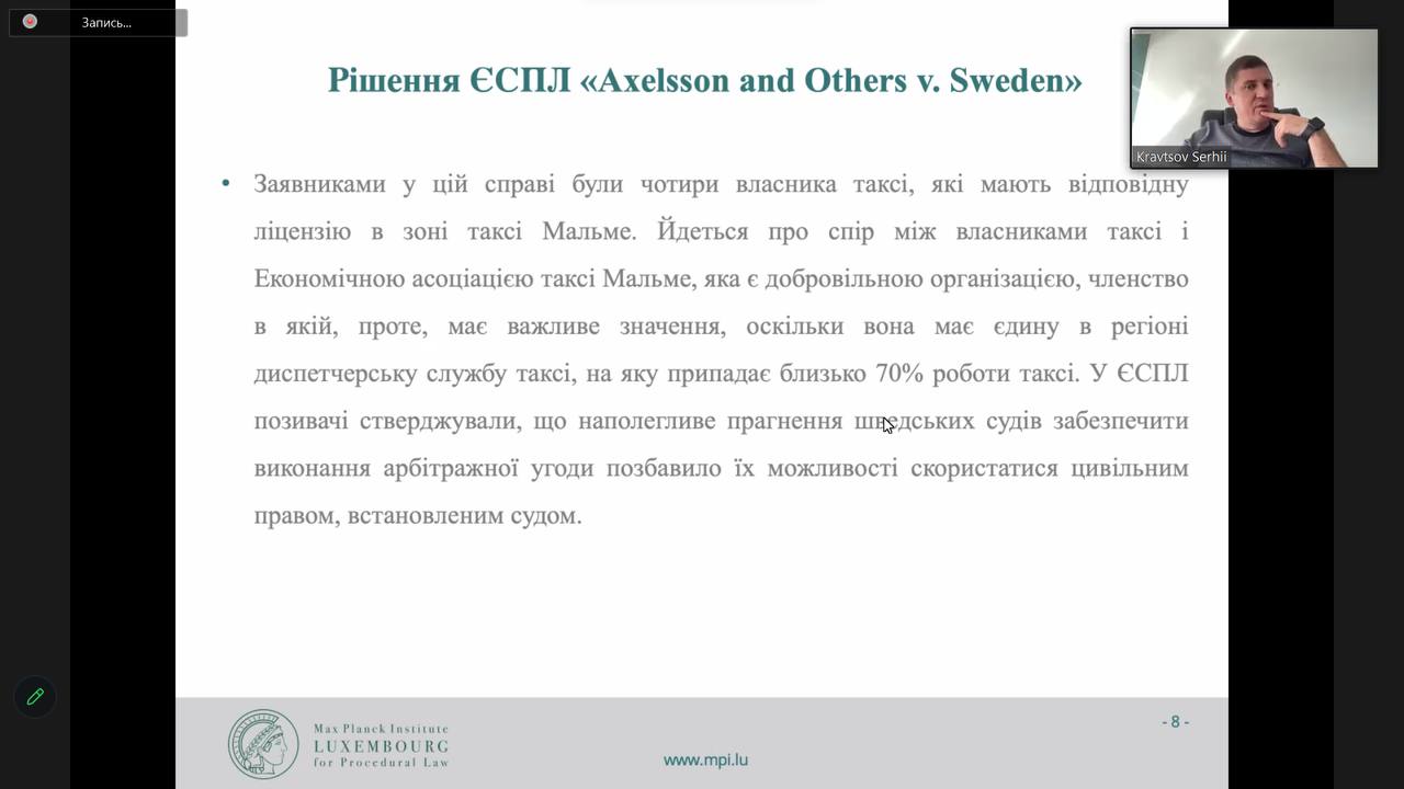 Під час заходу виступили: секретар Пленуму Верховного Суду Дмитро Луспеник із доповіддю “Цивільний процес в умовах війни: проблеми правового регулювання та судова практика”, суддя Касаційного цивільного суду у складі Верховного Суду Наталія Сакара із доповіддю “Зловживання процесуальними правами та право на справедливий судовий розгляд в цивільному судочинстві”, д.ю.н. Юрій Притика із доповіддю “Санкції в практиці міжнародного комерційного арбітражу”, д.ю.н. Ірина Ізарова із доповіддю “На шляху до забезпечення права на справедливий суд: дослідження національної судової практики”, д.ю.н. Оксана Хотинська-Нор із доповіддю “Українські реалії забезпечення незалежного правосуддя в умовах криз”, к.ю.н. Сергій Кравцов із доповіддю “Право на справедливий суд при розгляді справ міжнародним комерційним арбітражем”, к.ю.н. Оксана Угриновська із доповіддю “Відшкодування шкоди, завданої збройною агресією рф: проблеми правозастосовчої практики та реалізації права на справедливий суд”, к.ю.н. Олександр Снідевич із доповіддю “Перешкоди у добровільному виконанні судових рішень в Україні як порушення права на справедливий суд у цивільному судочинстві”.