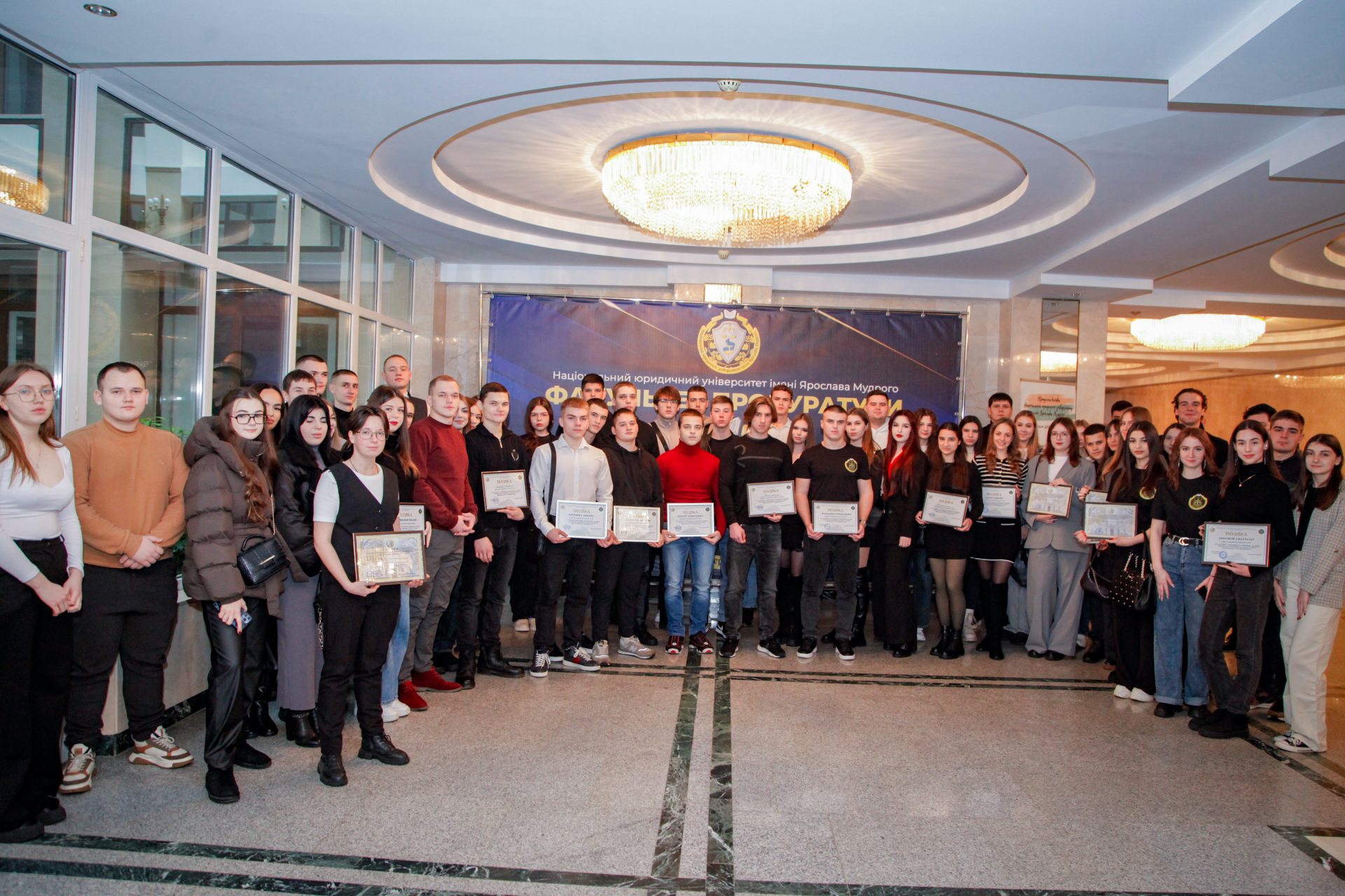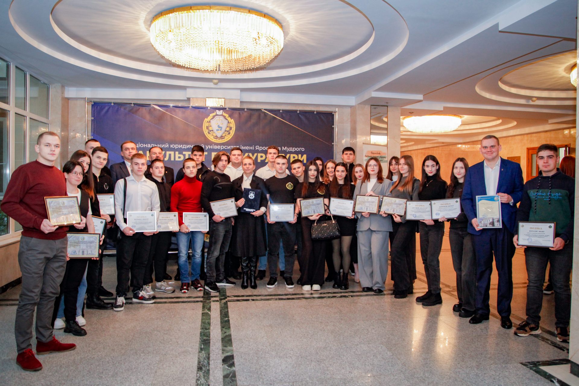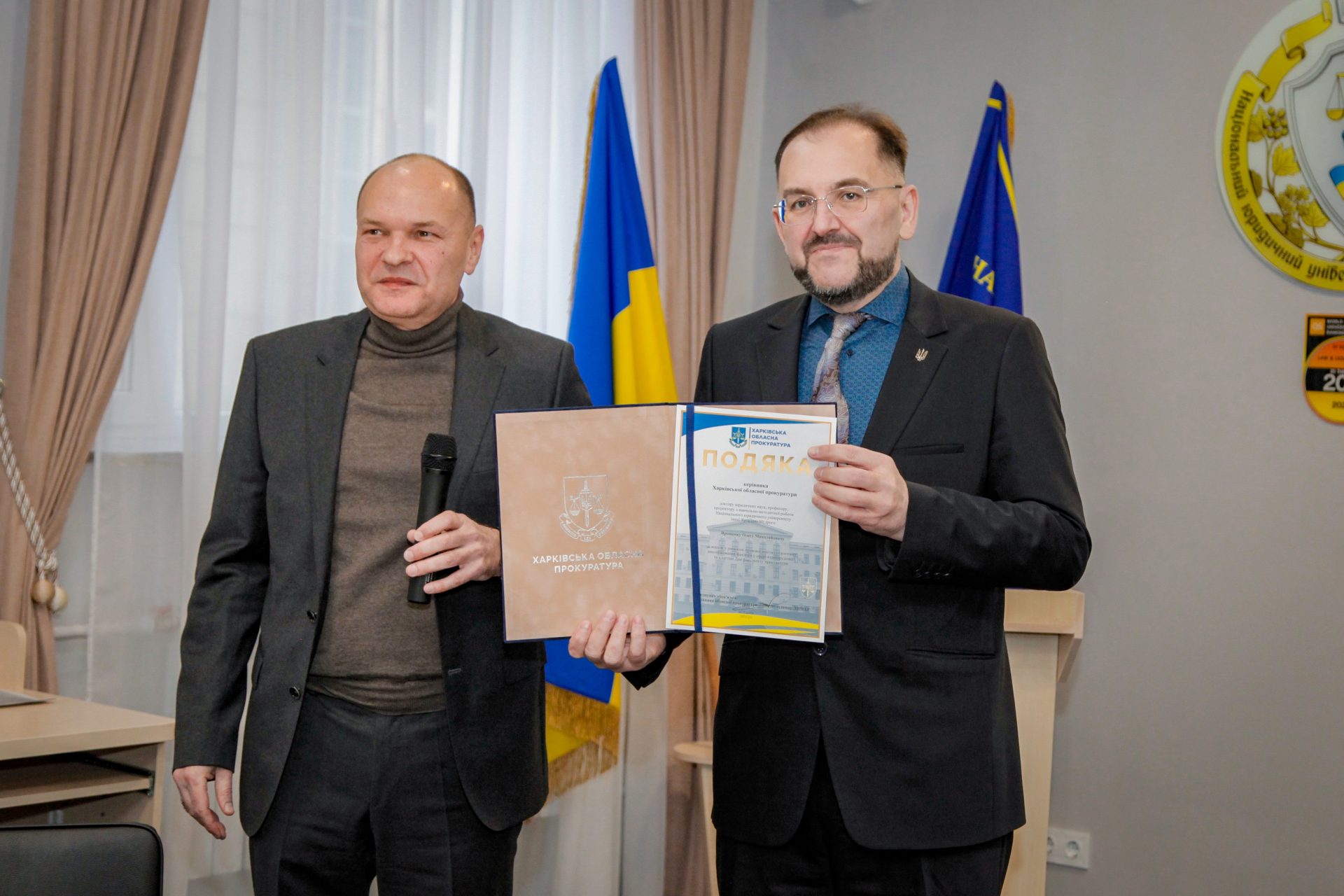 З нагоди Дня факультету Олег Ярошенко нагородив здобувачів факультету прокуратури Почесними грамотами та Подяками Ректора Університету. Від імені виконуючого обов’язки керівника Харківської обласної прокуратури Володимира Лимаря з вітальною промовою до колективу Факультету звернувся начальник відділу кадрової роботи та державної служби Харківської обласної прокуратури Олексій Лесенко. Олексій Лесенко, будучи випускником факультету прокуратури, в своїй промові згадав про щасливі студентські роки, про те як проходив розподіл до органів прокуратури і побажав студентам досягти успіху та гідно нести звання випускників Національного юридичного університету імені Ярослава Мудрого.