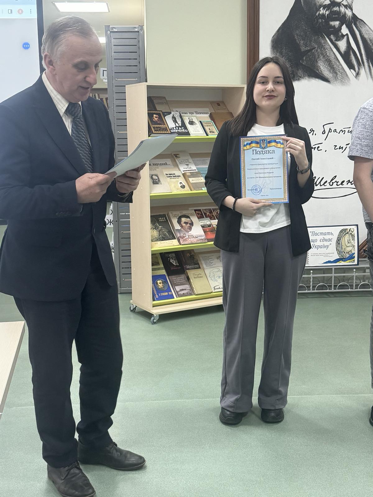 Учасникам читань були вручені подяки, а школярі на пам’ять отримали сувеніри, які люб’язно надало видавництво “Право”. Під час огляду книжкової експозиції «Шевченкіана у фондах наукової бібліотеки» юні шанувальники поезії ознайомилися з раритетними виданнями творів Тараса Шевченка: оригінальними текстами, документами, унікальними книгами за жанровим, мовним, географічним, хронологічним змістом і поліграфічним оформленням. Також для гостей була проведена оглядова екскурсія навчально-бібліотечним комплексом, де вони змогли відвідати картинну галерею, зони для навчання, самопідготовки, відпочинку з настільними іграми, відділ рідкісних видань, а також познайомитися ближче із затишними залами бібліотеки.