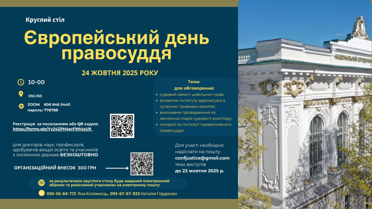 Кафедра цивільної юстиції та адвокатури Національного юридичного університету імені Ярослава Мудрого щиро запрошує вас взяти участь у круглому столі, що відбудеться 24 жовтня 2025 року з нагоди Дня Європейської юстиції, який відзначається щороку.