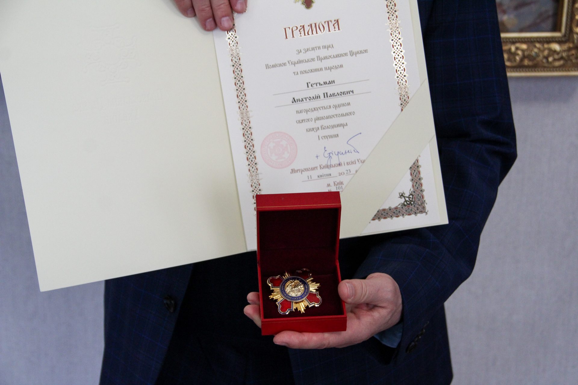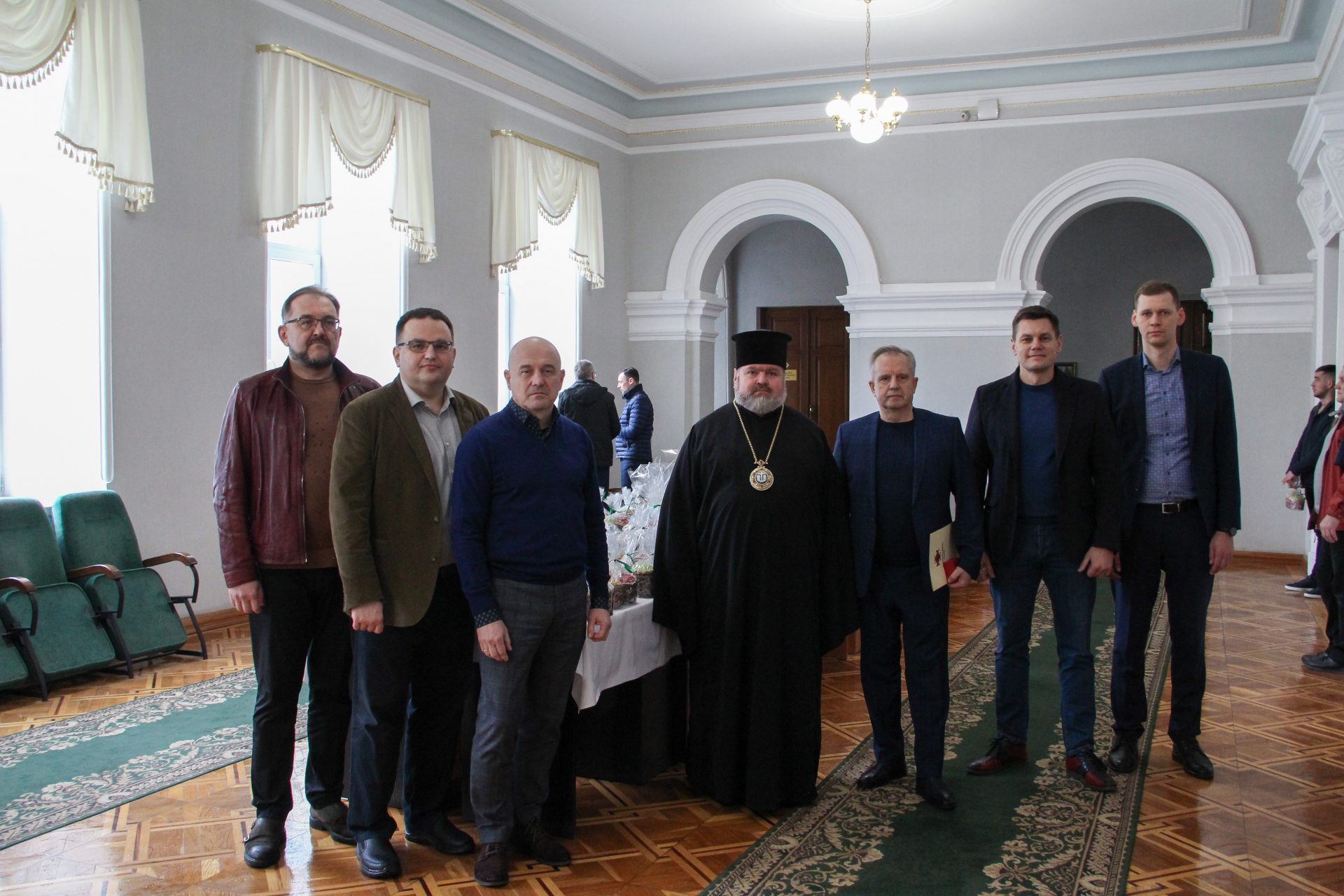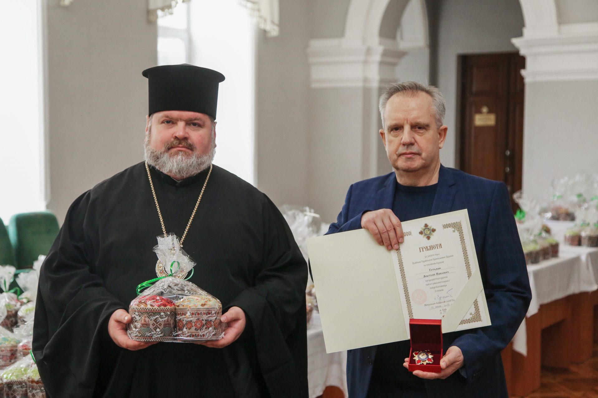 Після освячення пасок Владика Мітрофан привітав Анатолія Павловича із заслуженим відзначенням – почесним орденом святого рівноапостольного князя Володимира 1 ступеня. Урочисто вручивши грамоту та орден за заслуги, Владика Мітрофан відзначив, що це заслужена винагорода за невтомну працю, вагомий внесок в розвиток освіти та науки, а також встановлення міцних духовних зв’язків між університетською спільнотою та місцевою церковною громадою.