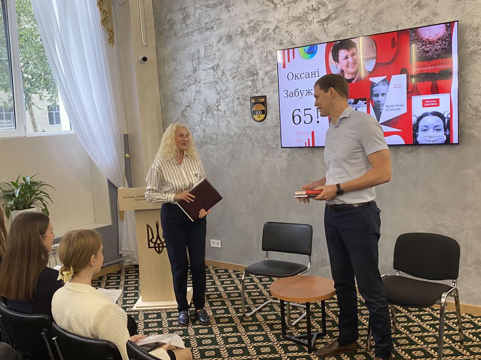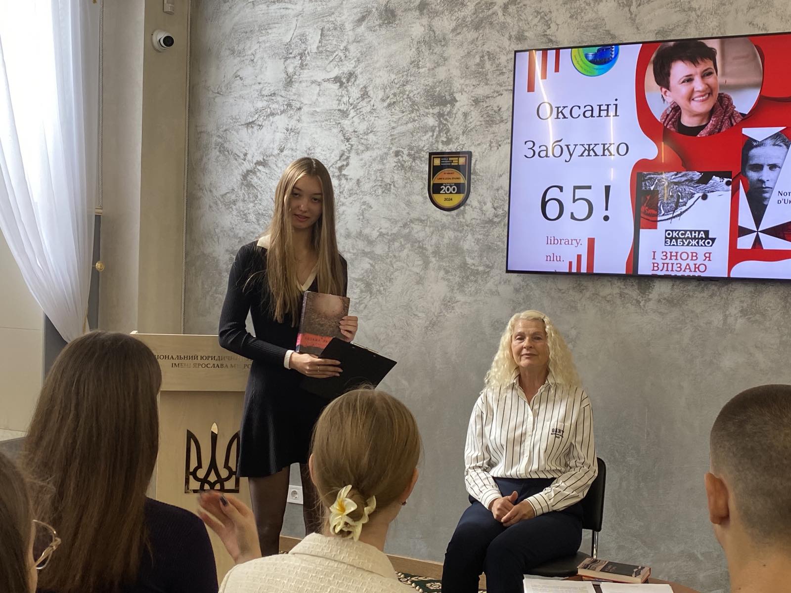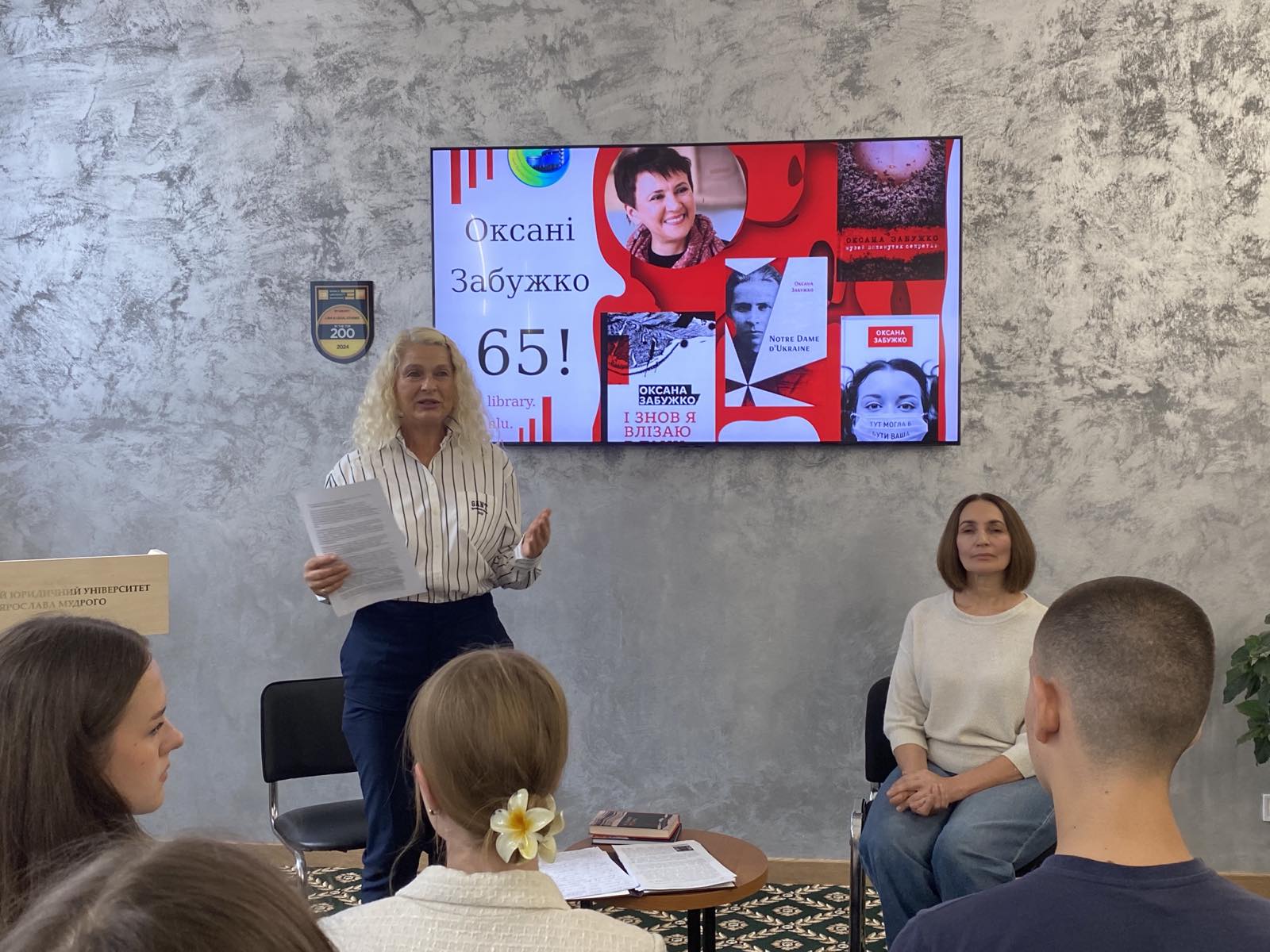 Книжкову виставку «Творчість, яка надихає» презентувала Еліна Сипченко. Вона представила найвідоміші книги письменниці, серед яких романи, поезія, есеїстика, а також публікації про її літературний шлях і вагомий внесок у розвиток української культури. Запрошуємо усіх охочих в університетську бібліотеку познайомитися з творчістю Оксани Забужко ближче, відкрити для себе нові смисли та відчути силу українського слова!