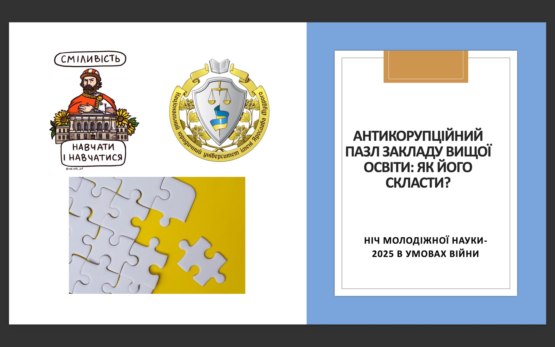 Наталія Сметаніна, Доцент кафедри кримінально-правової політики, керівник уповноваженого підрозділу з питань запобігання та виявлення корупції, В.о. Голови ради молодих вчених Національного юридичного університету імені Ярослава Мудрого представила доповідь на тему: “Антикорупційний пазл закладу вищої освіти: як його скласти?” У презентації висвітлені основні етапи та інструменти розбудови системи антикорупційного комплаєнсу у закладах вищої освіти. Окрему увагу було приділено особливостям підготовки та реалізації сучасної антикорупційної програми ЗВО, національному і міжнародному досвіду розбудови антикорупційної системи.
