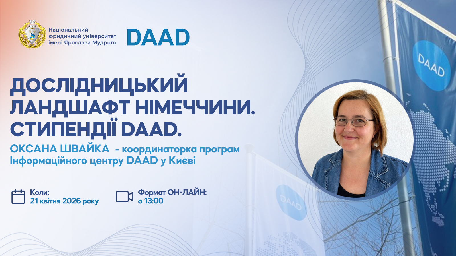🔷 Спікерка: Оксани Швайки – координаторка програм Інформаційного центру DAAD у Києві.