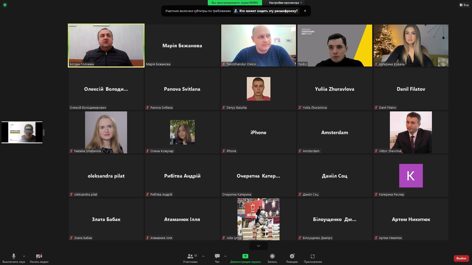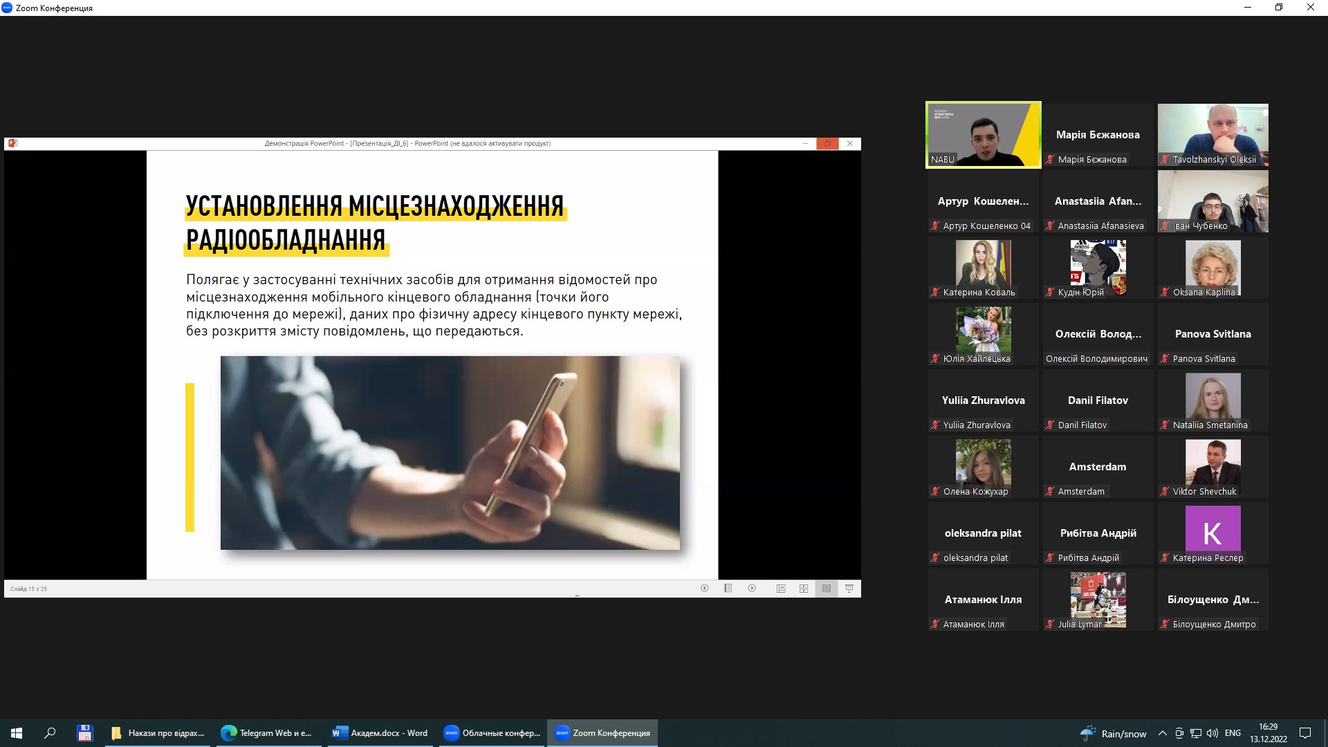 Старший детектив НАБУ Віктор розказав учасникам онлайн зустрічі про застосування негласних слідчих (розшукових) дій під час топкорупційного розслідування. Детектив розповів слухачам про етапи, строки та документи, необхідні для проведення НСРД. Детально зупинився на різних видах негласних слідчих заходів, як-от відеоконтроль місця чи особи, огляд і виїмка кореспонденції, розмежував такі заходи як зняття інформації з електронних та мереж і електронних інформаційних систем.