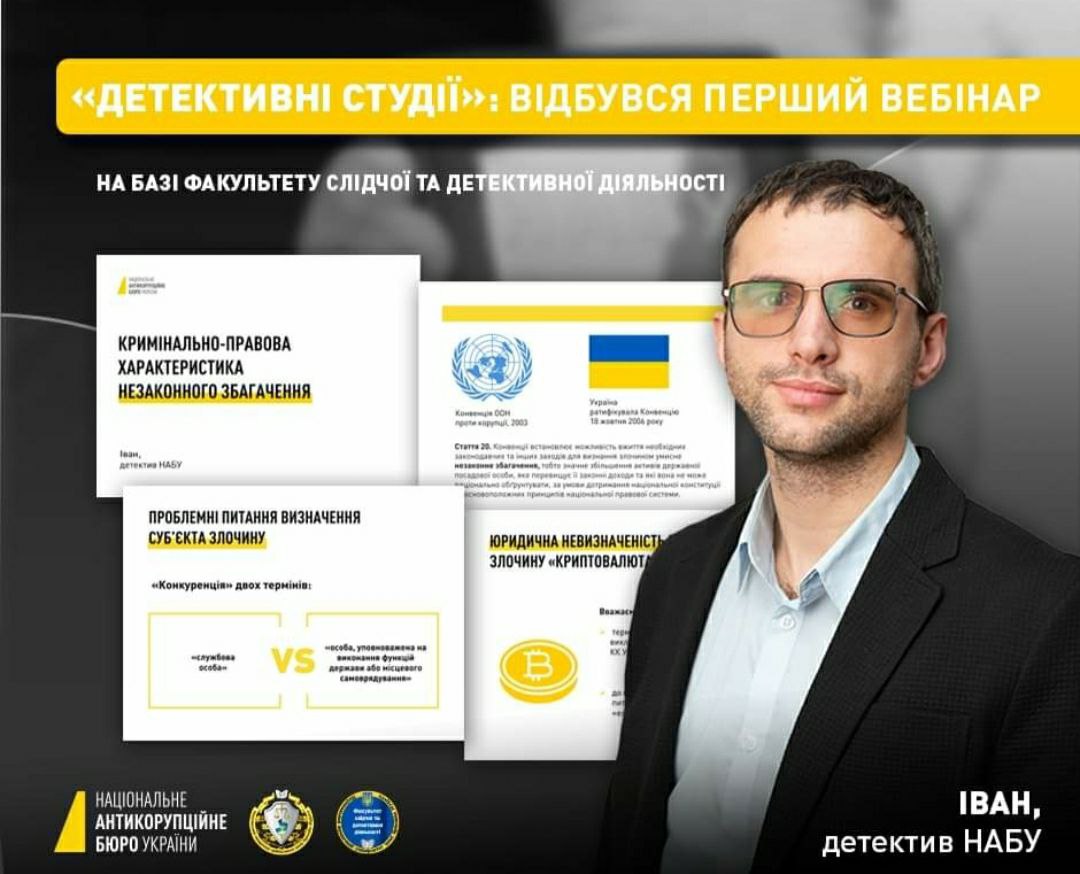 Факультет слідчої та детективної діяльності Національного юридичного університету імені Ярослава Мудрого у співпраці з НАБУ реалізує інноваційний освітній проєкт «Детективні студії». Він складається із серії вебінарів, присвячених актуальним проблемам боротьби із злочинністю та топкорупцією.