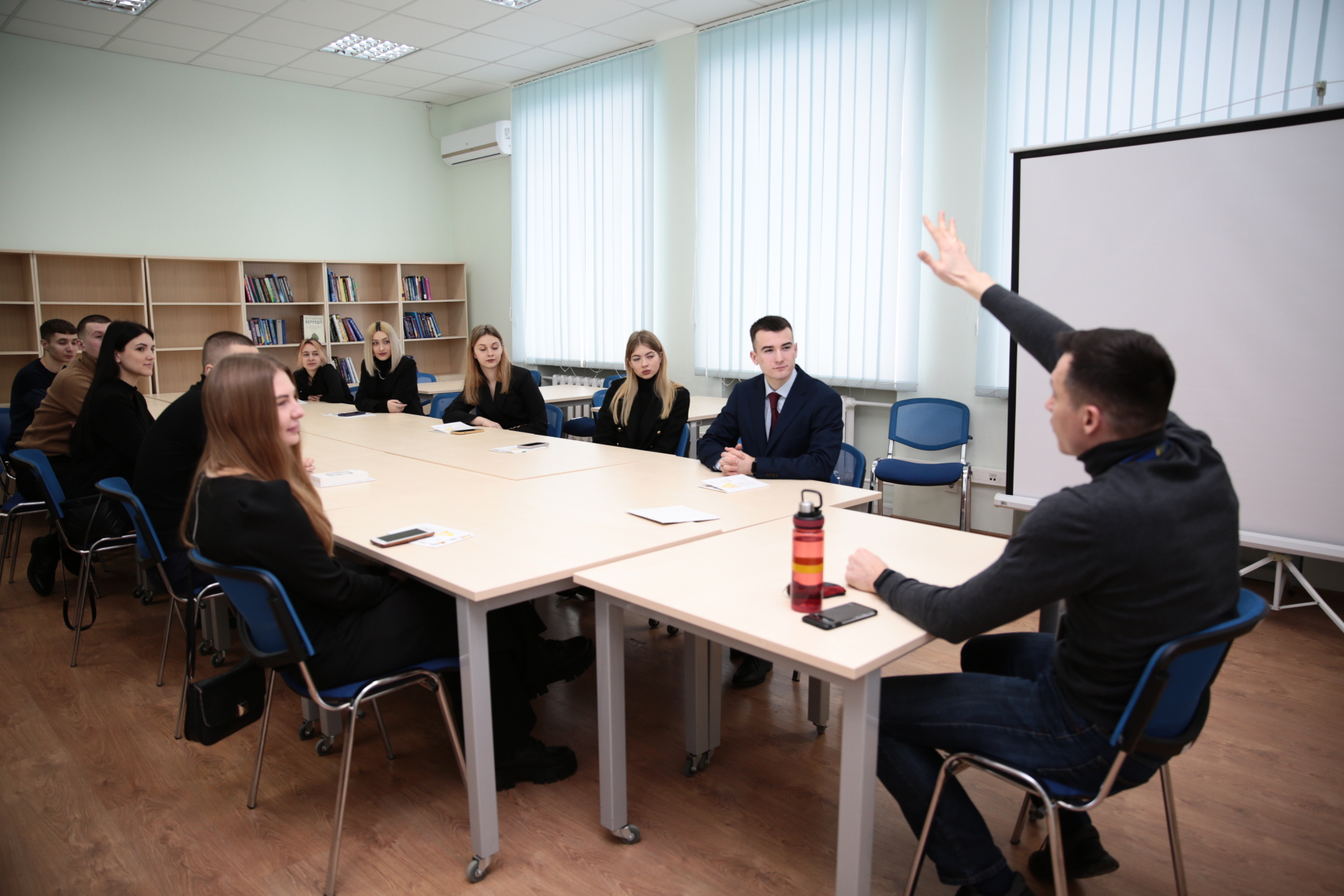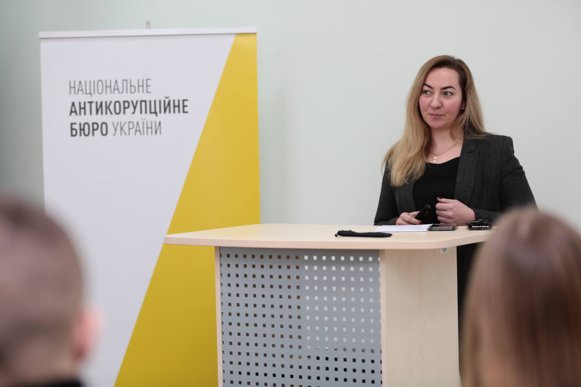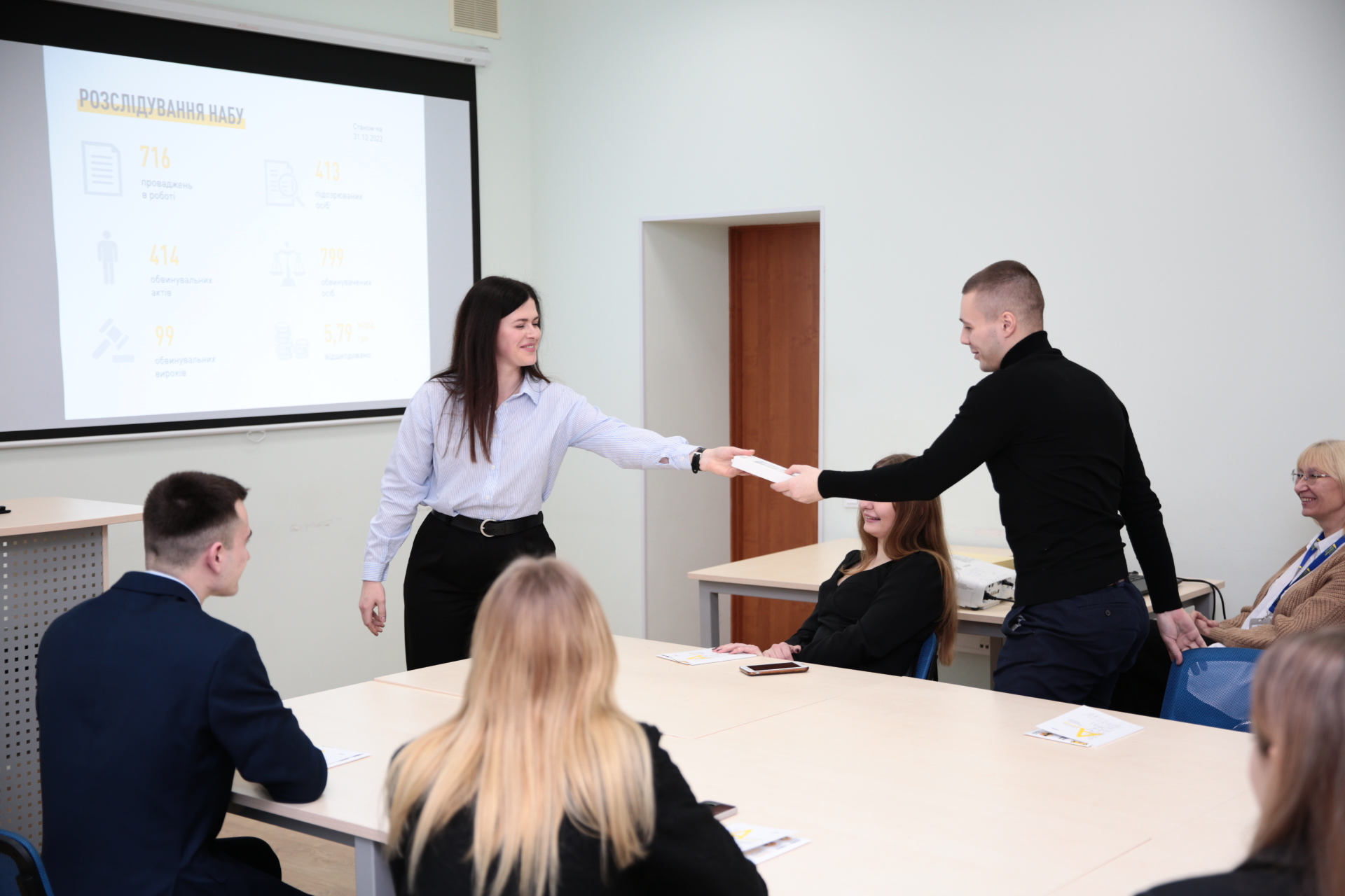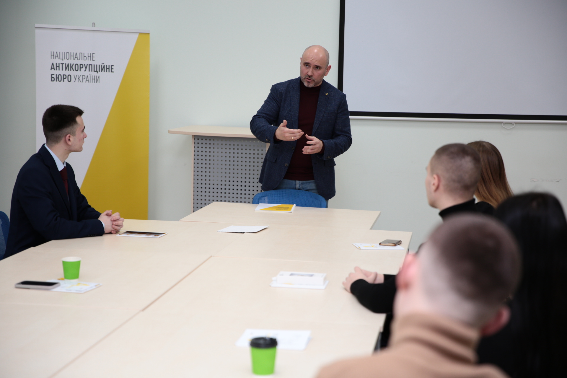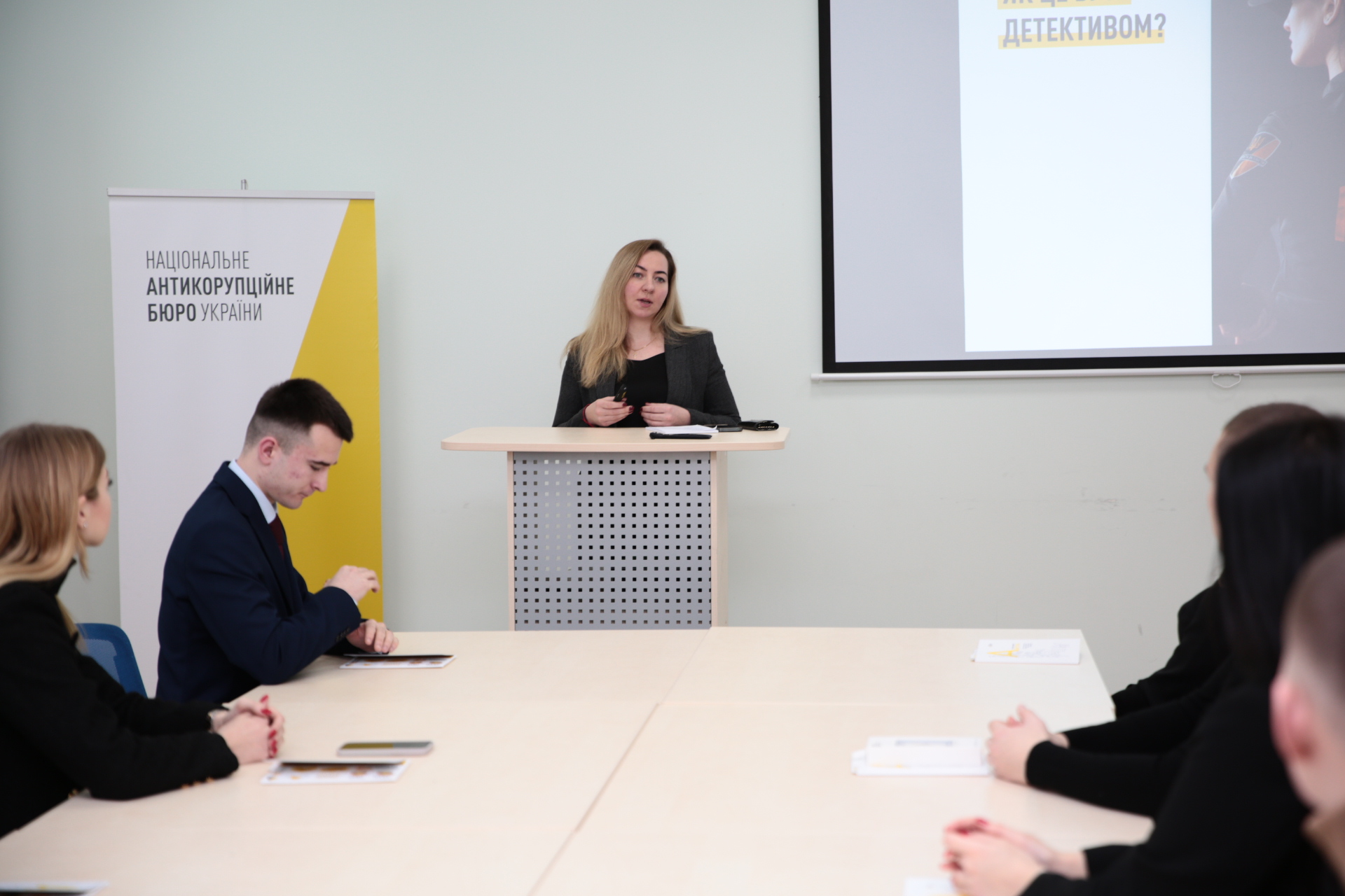 На зустрічі з представниками Управління зовнішніх комунікацій студенти дізналися про історію становлення НАБУ, його структуру, штатну чисельність, основні досягнення, внесок працівників НАБУ в оборону України від зовнішньої агресії, економічний ефект від діяльності вказаного правоохоронного органу, а також просвітницькі проєкти для молоді.