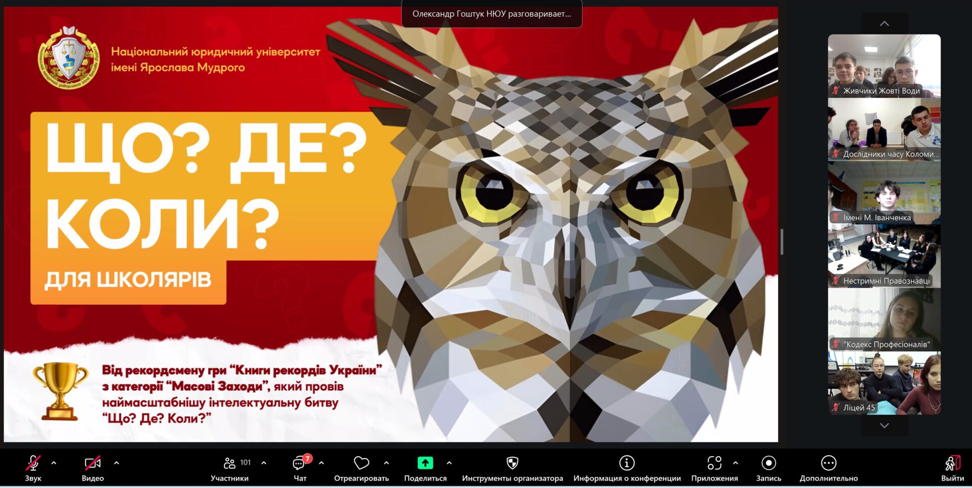 ❗Для довідки! У 2021 році Університет увійшов до «Книги рекордів України» як заклад, що провів наймасштабнішу інтелектуальну онлайн гру «Що? Де? Коли?». Рекорд внесено до категорії «Масові заходи». Офіційно зафіксований результат – 273 команди. Загальна кількість учасників – 1426 осіб.