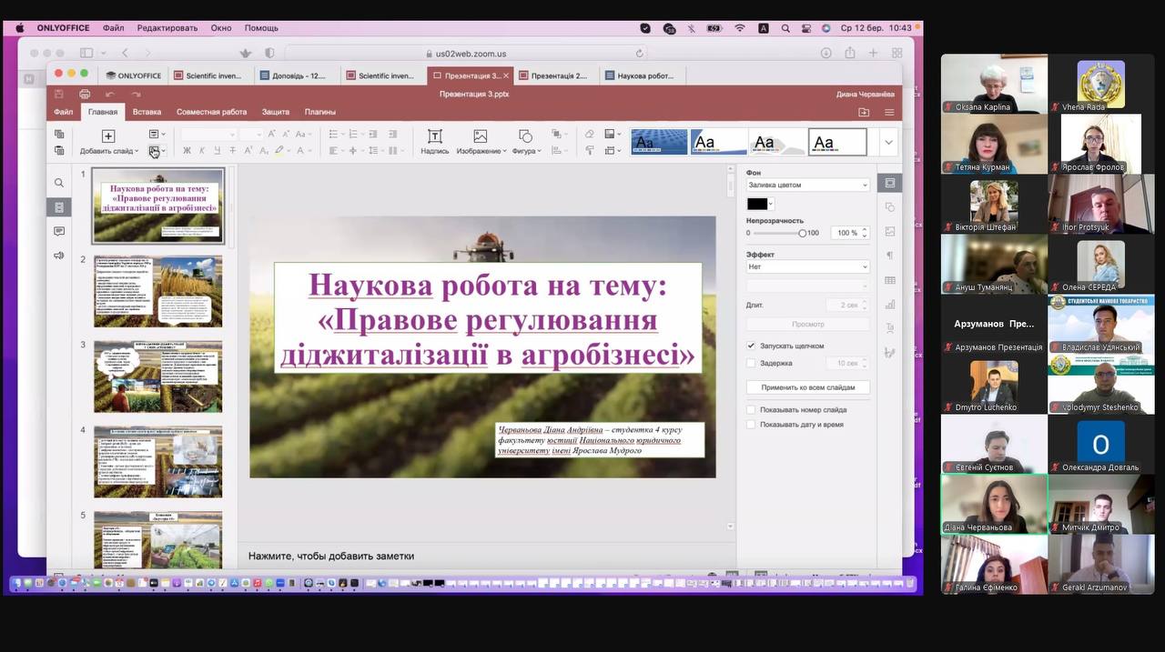 Черваньова Діана – студентка 4 курсу факультету юстиції за наукову роботу «Правове регулювання діджиталізації в агробізнесі» (науковий керівник – Корнієнко Ганна, д.ю.н., доцентка, доцентка кафедри земельного та аграрного права).