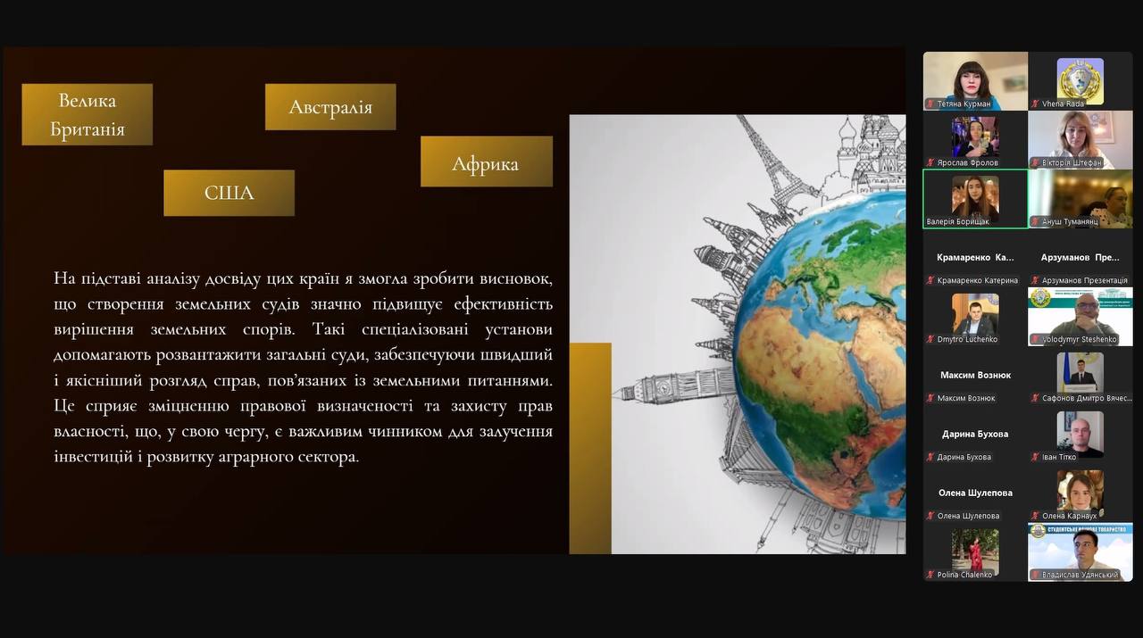 Борищак Валерія – студентка 4 курсу факультету прокуратури за наукову роботу «Забезпечення ефективного захисту земельних прав шляхом створення спеціалізованих земельних судів» (науковий керівник – Ігнатенко Ірина, к.ю.н., доцентка, доцентка кафедри земельного та аграрного права);