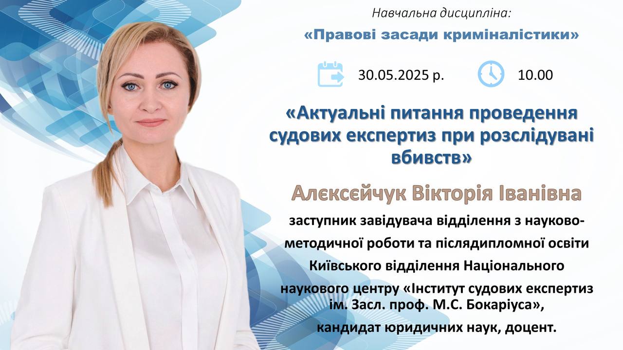 30 травня 2025 року на базі кафедри криміналістики Національного юридичного університету імені Ярослава Мудрого, Київського відділення Національного наукового центру «Інститут судових експертиз імені засл. проф. М. С. Бокаріуса» та Науково-дослідного інституту вивчення проблем злочинності імені академіка В. В. Сташиса було проведено бінарне заняття для аспірантів і здобувачів вищої освіти. Темою зустрічі стали «Актуальні питання проведення судових експертиз при розслідуванні вбивств», що викликала значний інтерес у молодих науковців та практиків.
