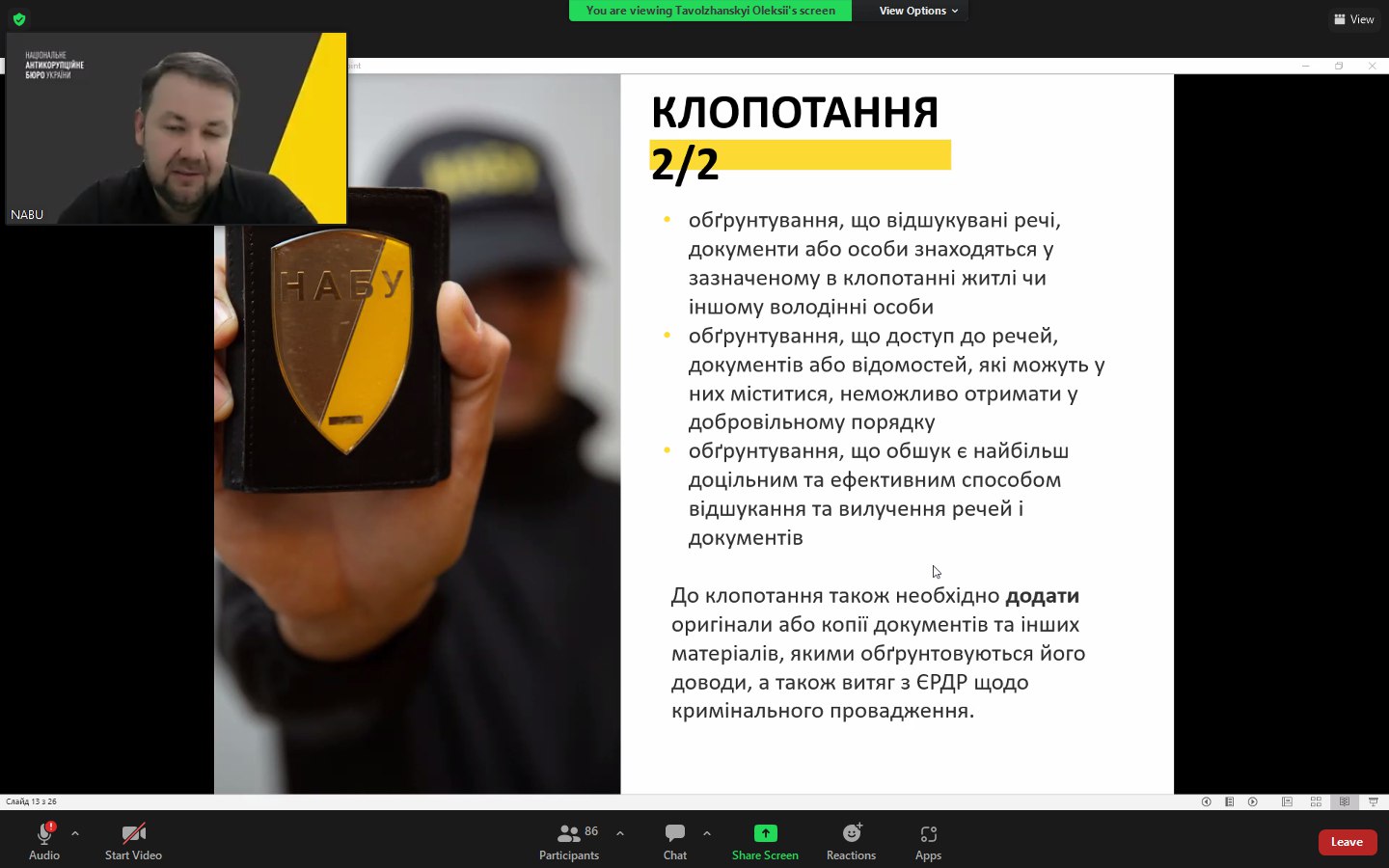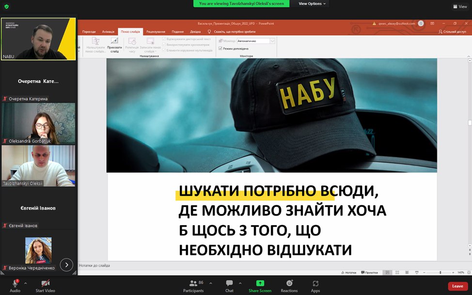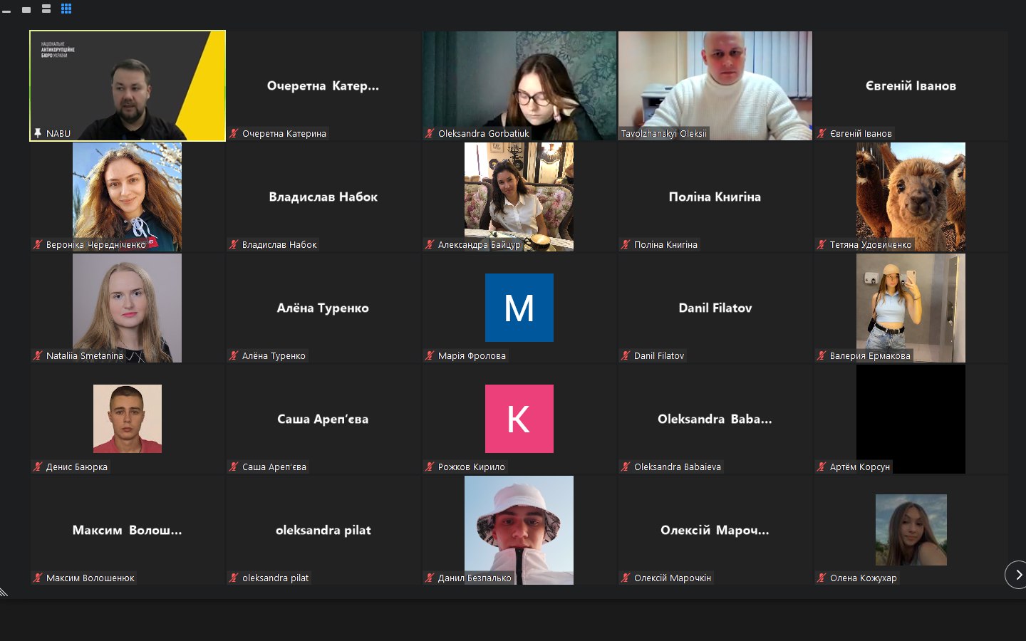 Факультет слідчої та детективної діяльності Національного юридичного університету імені Ярослава Мудрого у співпраці з НАБУ в рамках реалізації інноваційного освітнього проєкту «Детективні студії» проведено черговий вебінар, присвячений актуальним проблемам боротьби із злочинністю та топкорупцією .
