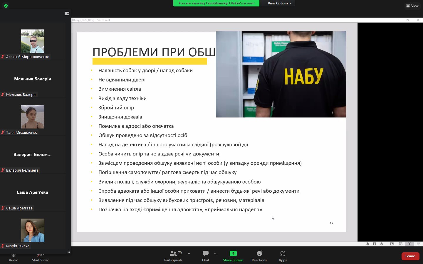 У середу, 09.11.2022 відбувся другий вебінар, на тему «Топкорупційне розслідування: проводимо обшук» , в якому взяли участь близько 100 студентів-правників, викладачів та аспірантів.