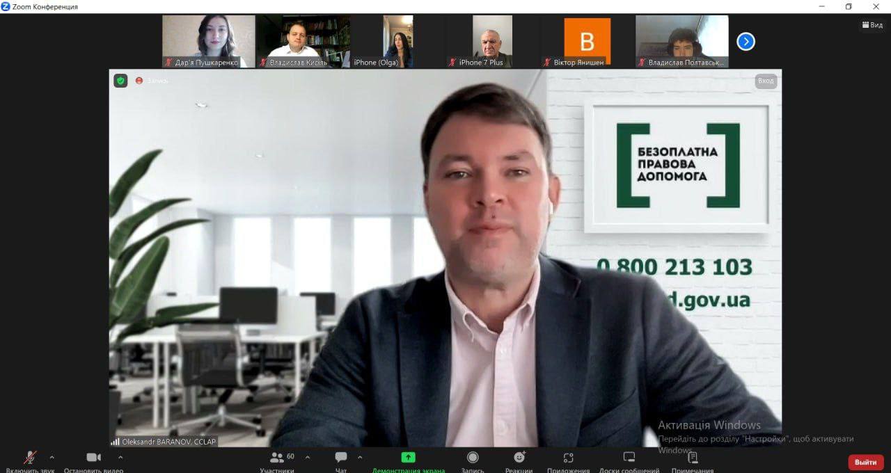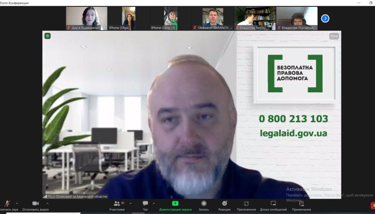 З вітальним словом виступив наш гість Владислав КИСІЛЬ – секретар Наглядової ради Національного юридичного університету імені Ярослава Мудрого, голова практик нерухомості та будівництва, банківського та фінансового права KPD Consulting Law Firm, адвокат, а також наші надійні та незмінні партнери: Олександр БАРАНОВ – директор Координаційного центру з надання правничої допомоги; Анатолій БОРОДАВКА – директор Регіонального центру з надання безоплатної вторинної правничої допомоги у Луганській та Харківській областях; Ольга КОРНЕВА – секретар Ради адвокатів Харківської області; Микола СІОМА – директор БО «Українська фундація правової допомоги».