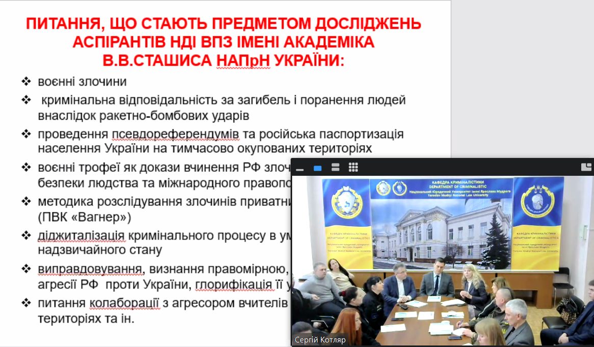 14 грудня 2023 року на кафедрі криміналістики Національного юридичного університету імені Ярослава Мудрого було проведено круглий стіл «Третій рівень освіти в Україні: актуальні питання підготовки дисертації в сучасних реаліях війни», присвячений обговоренню шляхів удосконалення підготовки аспірантів за напрямом «криміналістика», на якому було представлено бачення подолання зумовлених війною викликів у підготуванні та написанні дисертаційних досліджень.