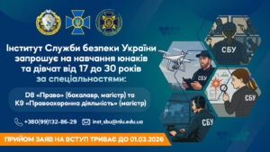 Інститут Служби безпеки України Національного юридичного університету імені Ярослава Мудрого запрошує на навчання випускників закладів середньої та вищої освіти для здобуття повної вищої освіти за спеціальностями D 8 «Право» (бакалавр, магістр) (081) та K 9 «Правоохоронна діяльність» (магістр) (262) в кращому юридичному військовому навчальному підрозділі України.