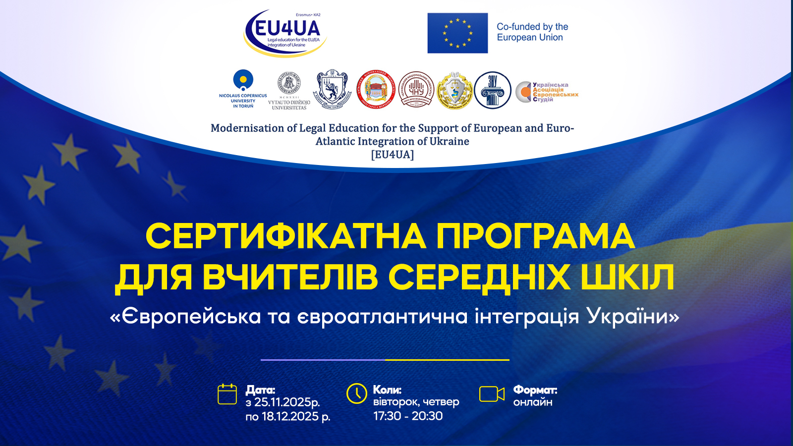 У період з 25.11.2025 р. по 18.12.2025 р. (включно) у рамках проєкту Еразмус+ Ка2 «Модернізація юридичної освіти для підтримки європейської та євроатлантичної інтеграції України» (EU4UA) буде проведено сертифікатна програму для вчителів (онлайн, вівторок, четвер 17:30-20:30).