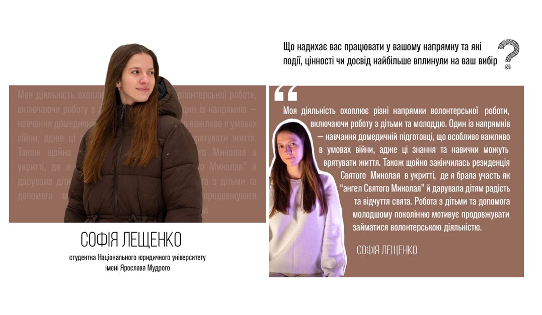 Софія Лещенко — активна, цілеспрямована та соціально відповідальна студентка, яка послідовно розвиває волонтерський рух у громаді. Її енергія, ініціативність і відповідальне ставлення до справи надихають молодь долучатися до волонтерської діяльності та переконливо доводять, що позитивні зміни починаються з конкретних дій кожного.