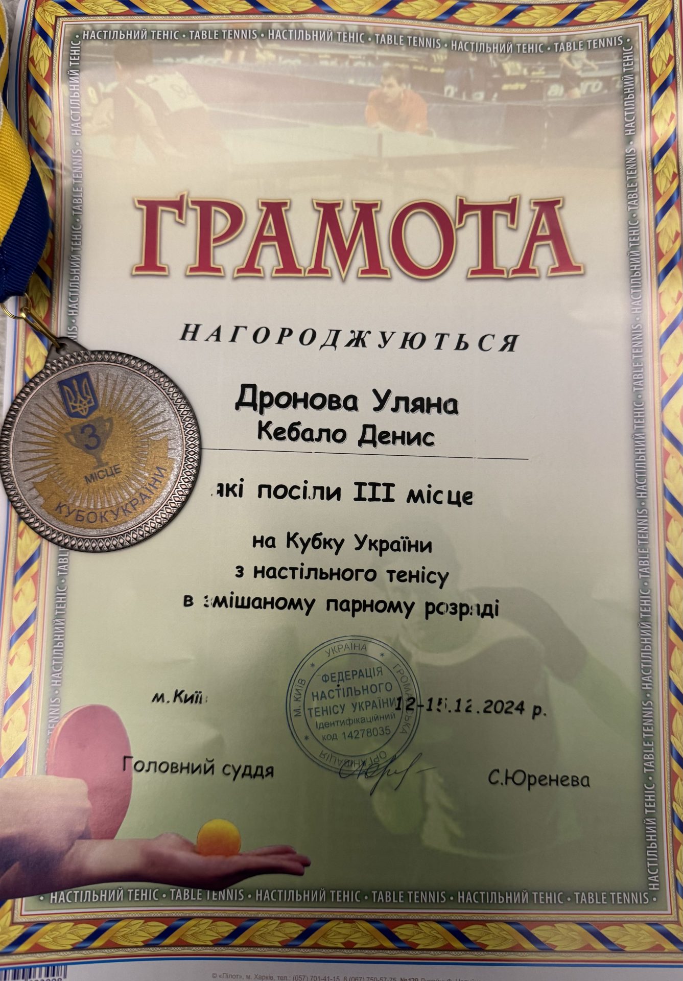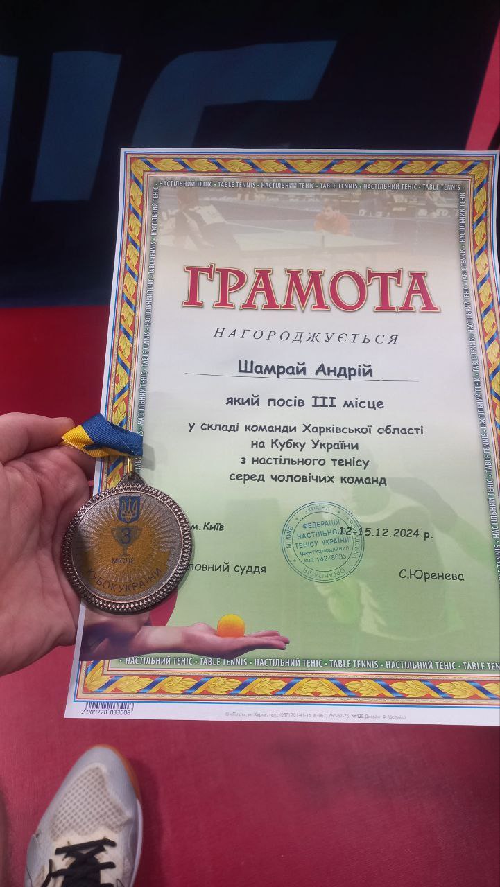 Студенти Університету Уляна Дронова (3 курсу, факультету юстиції) та Андрій Шамрай (4 курсу, факультету прокуратури) стали бронзовими призерами Кубку України з настільного тенісу. Змагання проходили з 12 по 15 грудня 2024 року в м. Києві.
