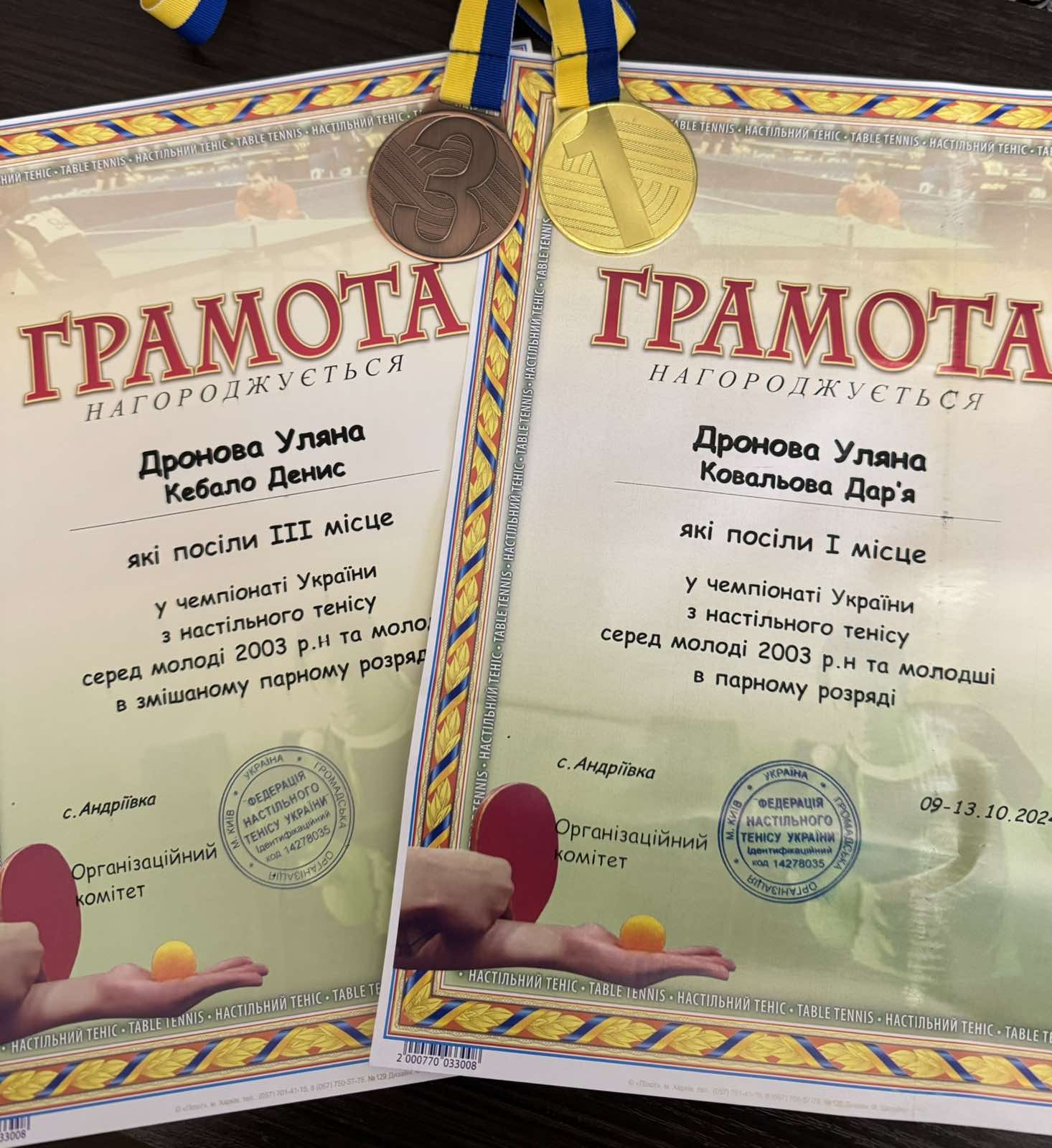 Студенти Університету Уляна Дронова та Андрій Шамрай стали чемпіонами України з настільного тенісу серед молоді
