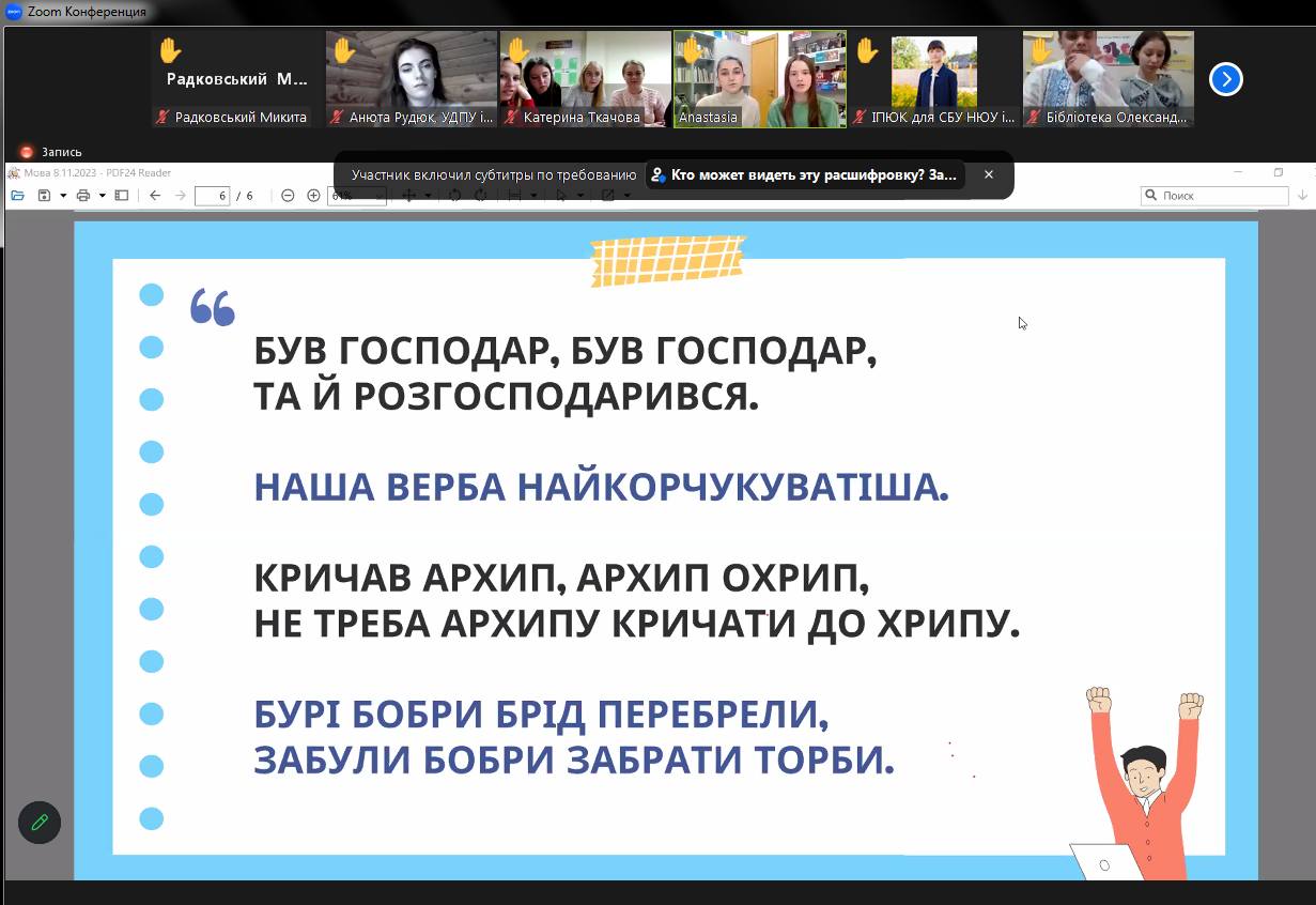 «Молодь та мова – єдність через Слово» під такою назвою 8 листопада 2023 року відбувся Міжнародний студентський інтелектуальний онлайновий турнір у якому взяли участь постійні учасники заходу — команди курсанти 1, 2, 3 курсів Інституту підготовки юридичних кадрів для СБУ НЮУ імені Ярослава Мудрого. Співорганізатором мовного марафону виступила Наукова бібліотека Університету.