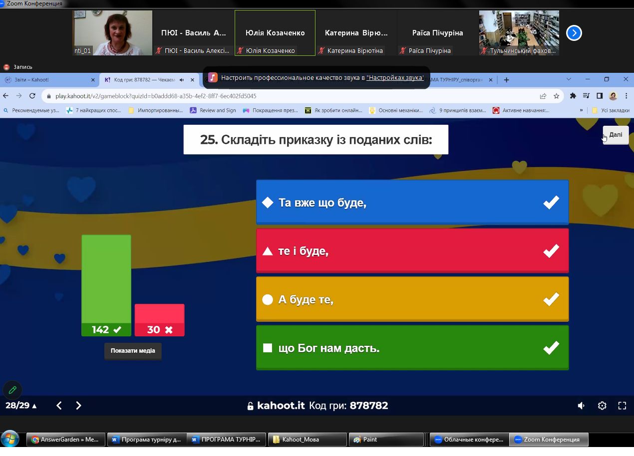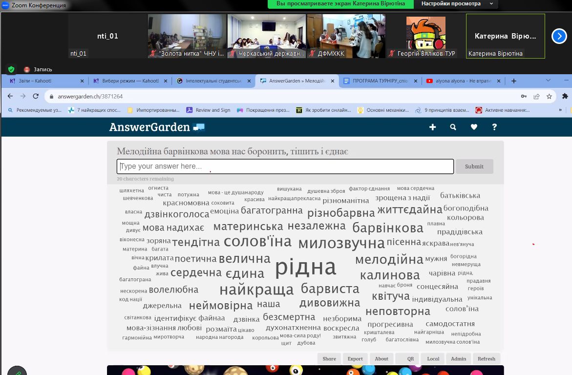 Інтерактивна тематична онлайн-вікторина, яка була створена на платформі цифрового інструменту навчання Kahoot, об’єднала усіх залюблених в українську мову, істинних шанувальників і знавців рідного слова — 30 команд закладів освіти із різних куточків країни, а також українських студентів із Туреччини, Німеччини, Швеції, Іспанії, Ізраїлю, Еміратів.