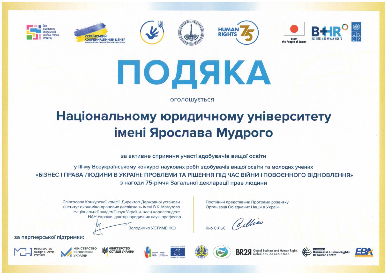 Відбулася Підсумкова науково-практична конференція ІІІ-го Всеукраїнського конкурсу наукових робіт здобувачів вищої освіти та молодих вчених «Бізнес і права людини в Україні: проблеми та рішення під час війни та повоєнного відновлення» з нагоди 75-річчя Загальної декларації прав людини.