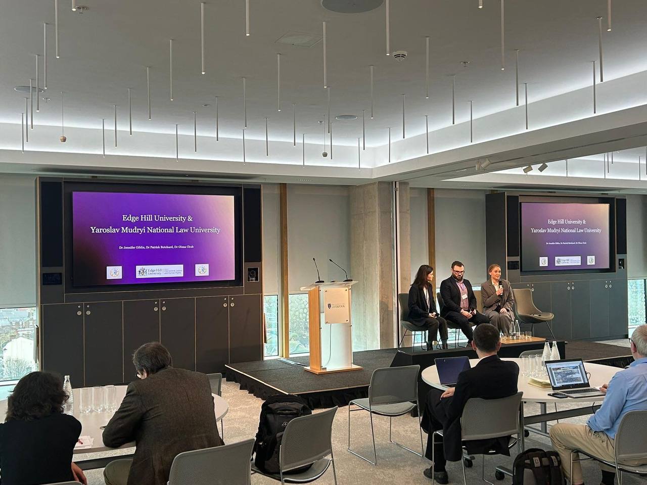 Спільна команда Edge Hill University (the UK) та НЮУ імені Ярослава Мудрого, Professor Jay Cullen, Dr Patrick Butchard, Dr Jennifer Giblin, Dr Olena Chub висвітлили досвід успішного твінінгу 2023 – серії вебінарів, літньої школи, парламентського заходу, підготовки спільного видання, а також потужні плани на найближче майбутнє.
