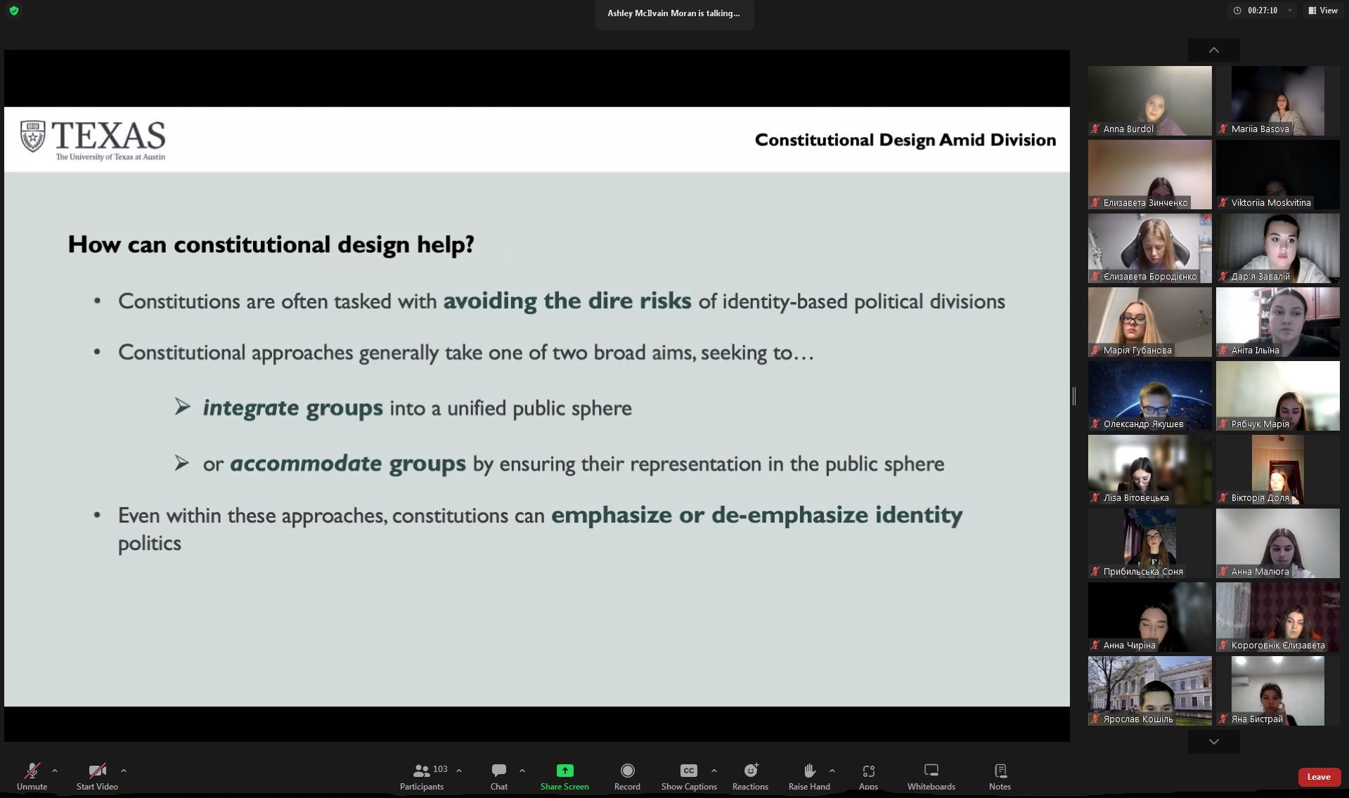 31 жовтня 2024 року Ешлі Макілвейн Моран, професорка Техаського університету в Остіні, наукова директорка проекту «Comparative Constitutions Project» та почесна наукова співробітниця Центру міжнародної безпеки та права ім. Роберта Штрауса університету штату Юта, прочитала лекцію на тему «Constitutional Design Amid Division».