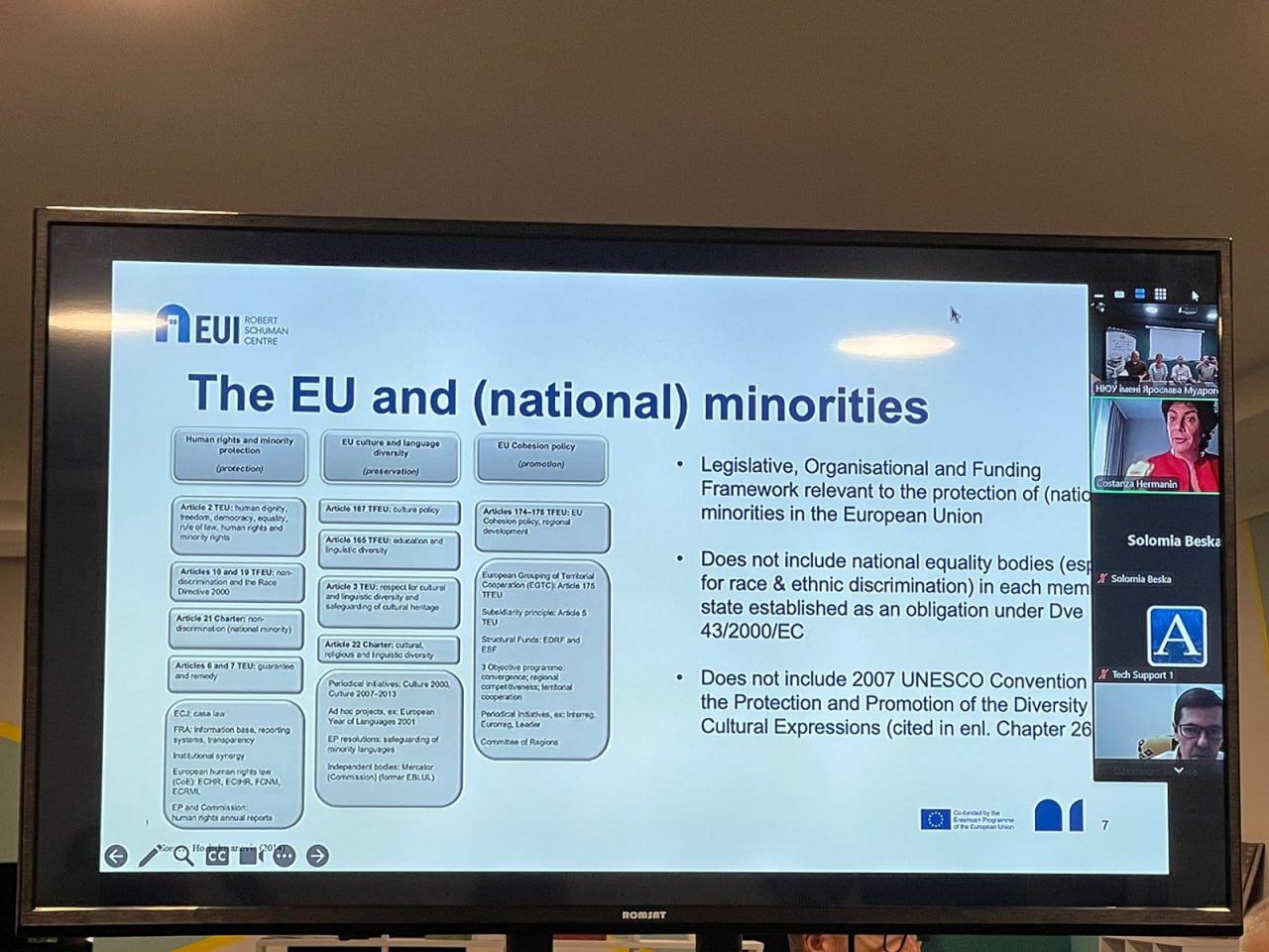 Під час воркшопу у форматі презентацій та дискусій обговорювались питання захисту національних меншин та корінних народів в умовах інтеграції України до Європейського Союзу, зокрема, розглядались вимоги до вступу нашої держави, котрі рекомендовані Європейським Союзом та викладені у коментарях Європейської комісії «За демократію через право» (Венеційська комісія), та питання їх адаптації до українського законодавства про правовий статус національних меншин, які кроки має здійснити Україна в умовах війни та які кроки потрібно зробити після її закінчення війни, а також стан забезпечення прав національних меншин та корінних народів в сучасних умовах в Україні.