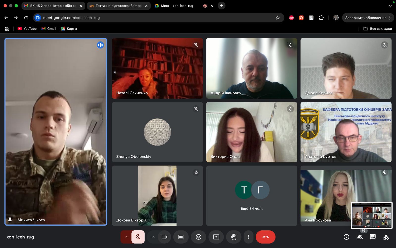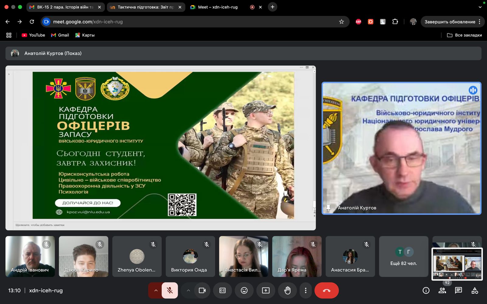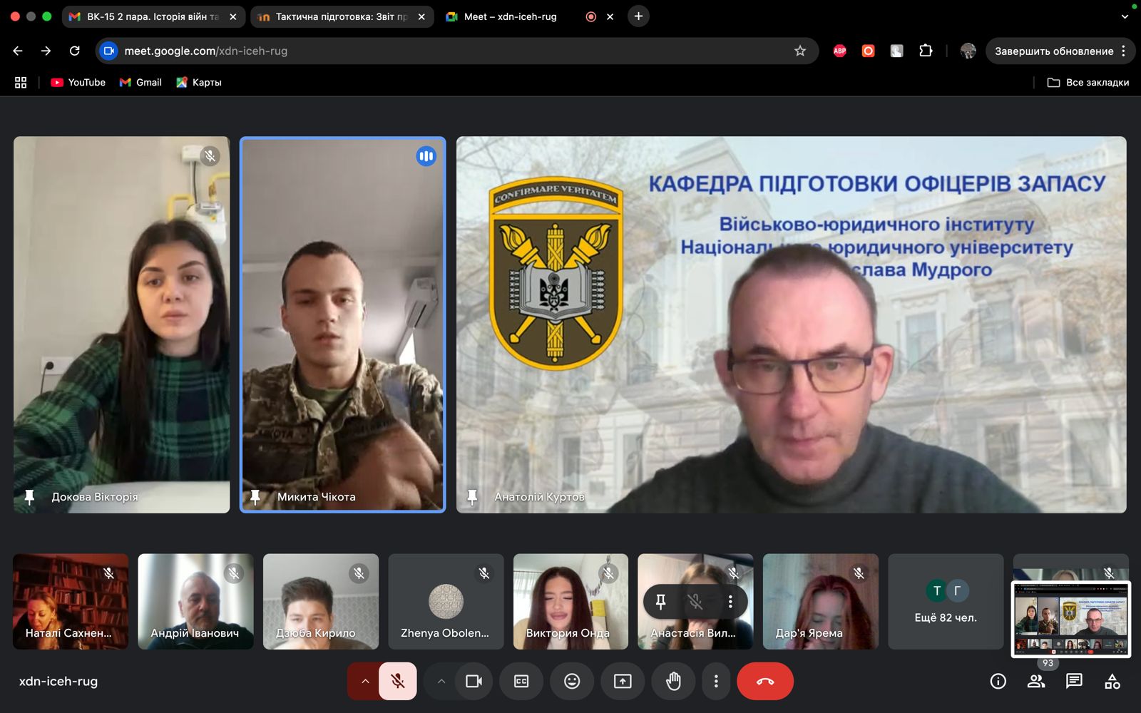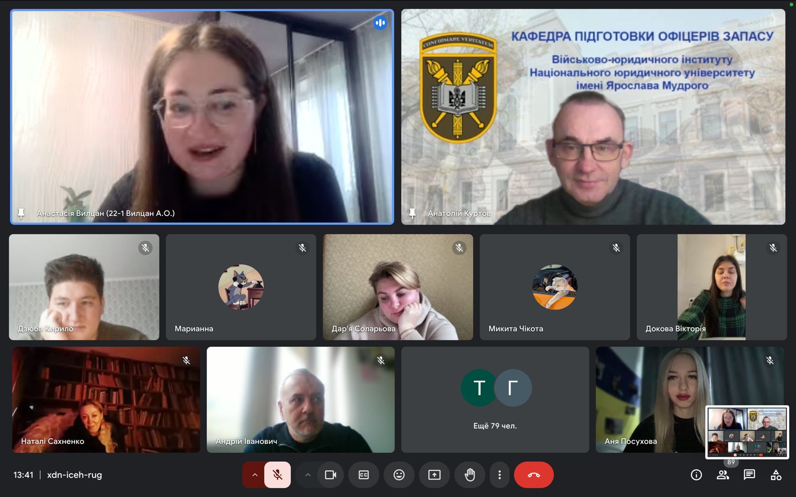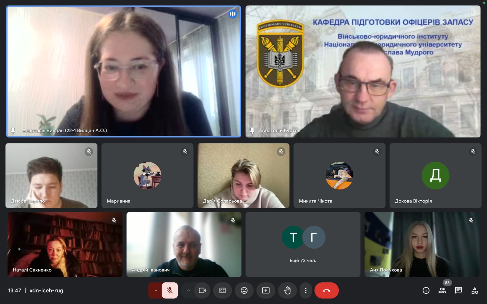 Модерував зустріч завідувач кафедри проф. Анатолій Куртов, а доповідачами виступили випускники кафедри, зокрема: Вікторія Докова – старший офіцер відділу організації правової роботи Департаменту юридичного забезпечення Міністерства оборони України, капітан юстиції; Микита Чикота – молодший лейтенант; Дар’я Соларьова – адвокат з військового права, молодший лейтенант; Маріанна Бочагіна – молодший лейтенант; Анастасія Вилцан – заступниця декана факультету прокуратури, асистентка кафедри криміналістики, молодший лейтенант; Юлія Пасічна – Почесний працівник прокуратури України – старший радник юстиції; випускниця кафедри 2024 та випускниця Університету 1996, молодший лейтенант запасу.