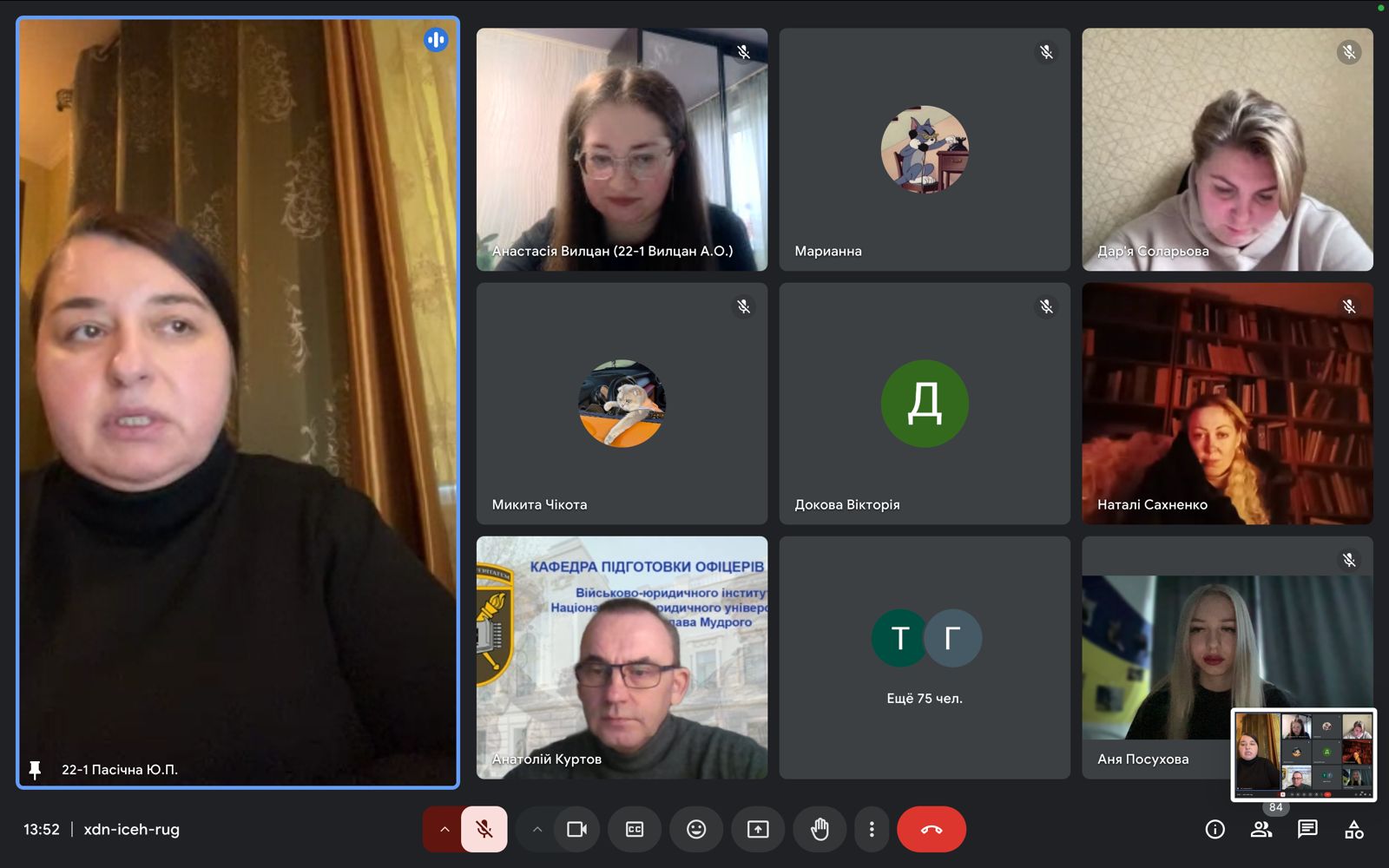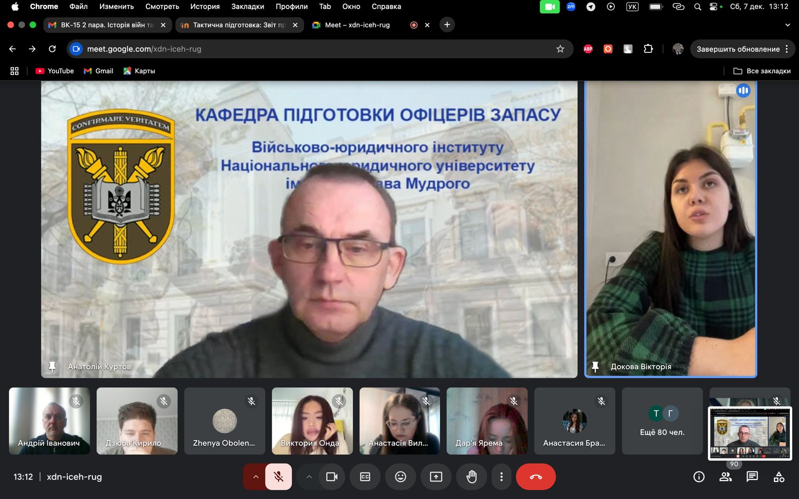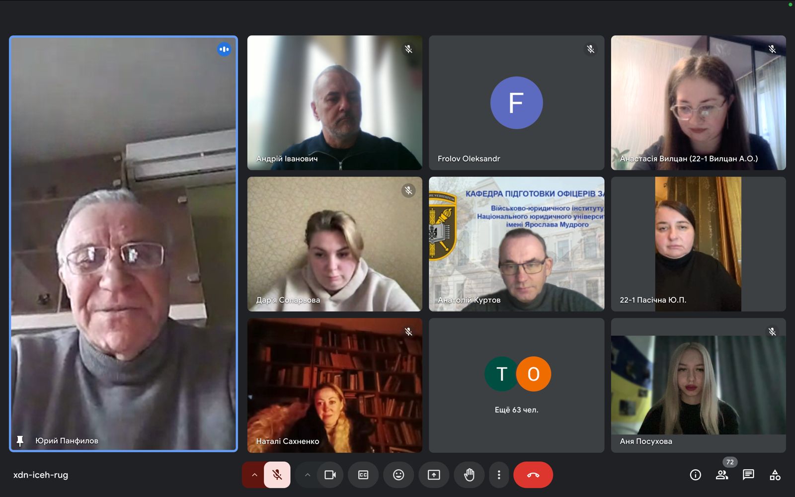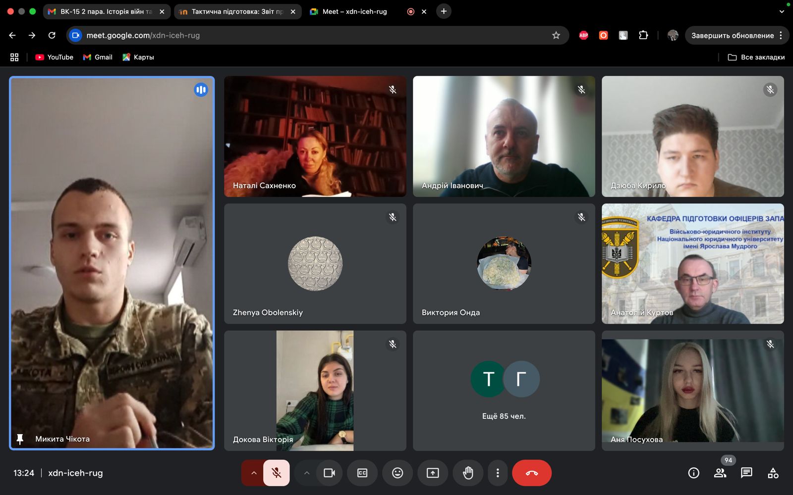 Модерував зустріч завідувач кафедри проф. Анатолій Куртов, а доповідачами виступили випускники кафедри, зокрема: Вікторія Докова – старший офіцер відділу організації правової роботи Департаменту юридичного забезпечення Міністерства оборони України, капітан юстиції; Микита Чикота – молодший лейтенант; Дар’я Соларьова – адвокат з військового права, молодший лейтенант; Маріанна Бочагіна – молодший лейтенант; Анастасія Вилцан – заступниця декана факультету прокуратури, асистентка кафедри криміналістики, молодший лейтенант; Юлія Пасічна – Почесний працівник прокуратури України – старший радник юстиції; випускниця кафедри 2024 та випускниця Університету 1996, молодший лейтенант запасу.