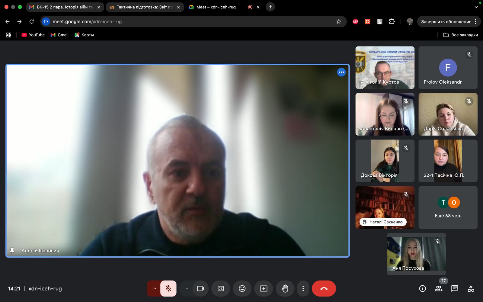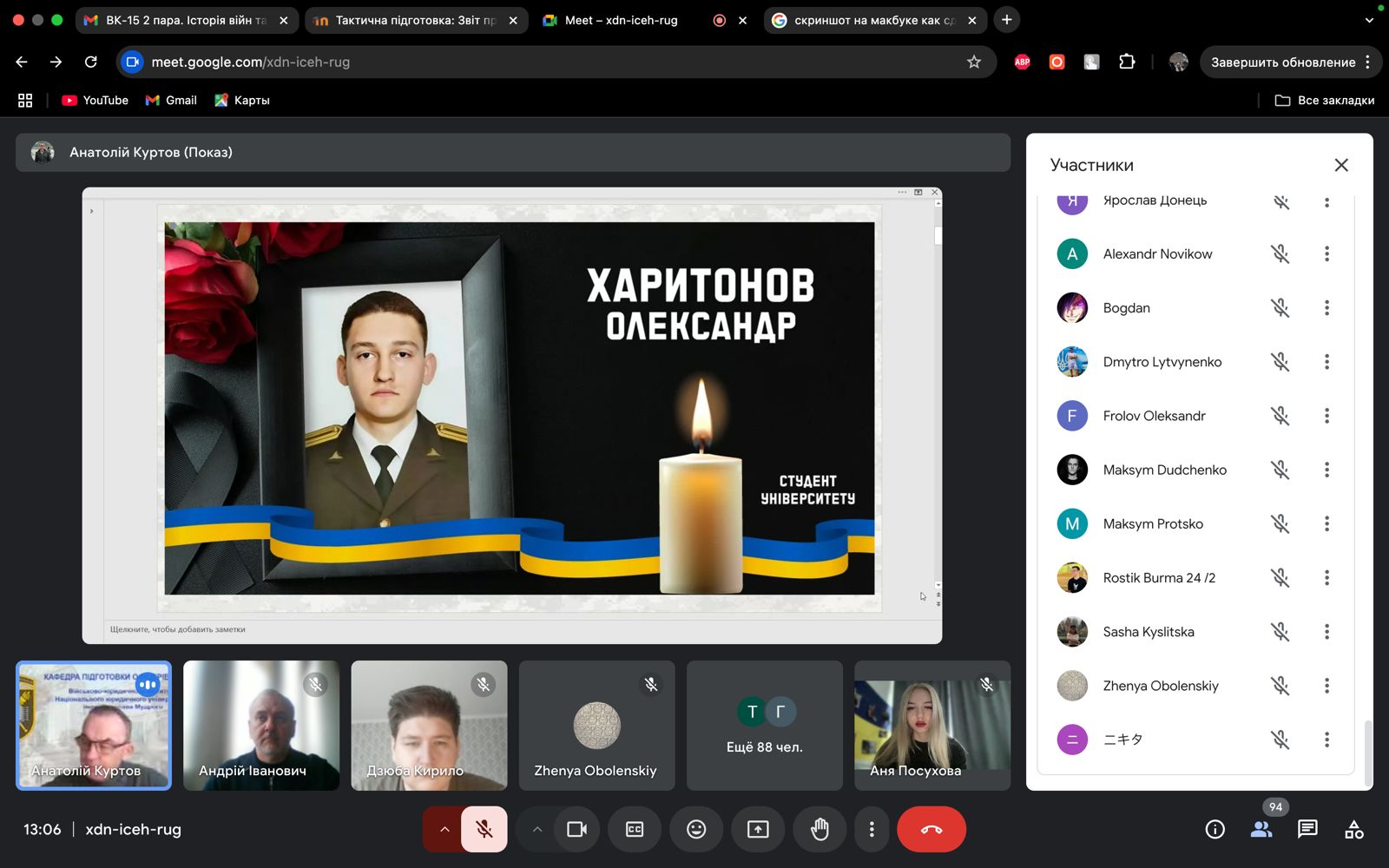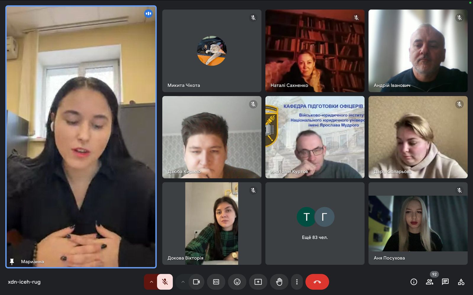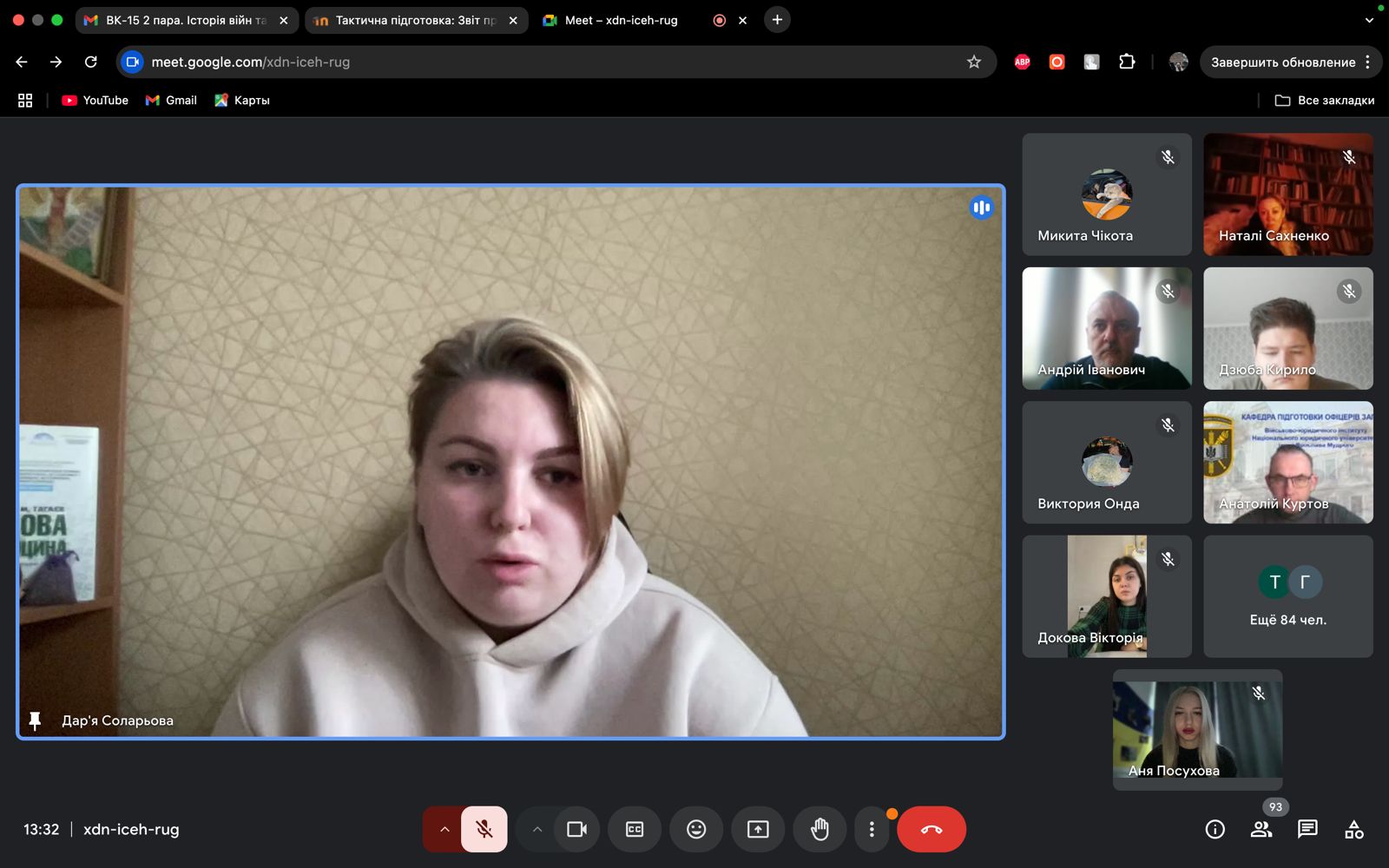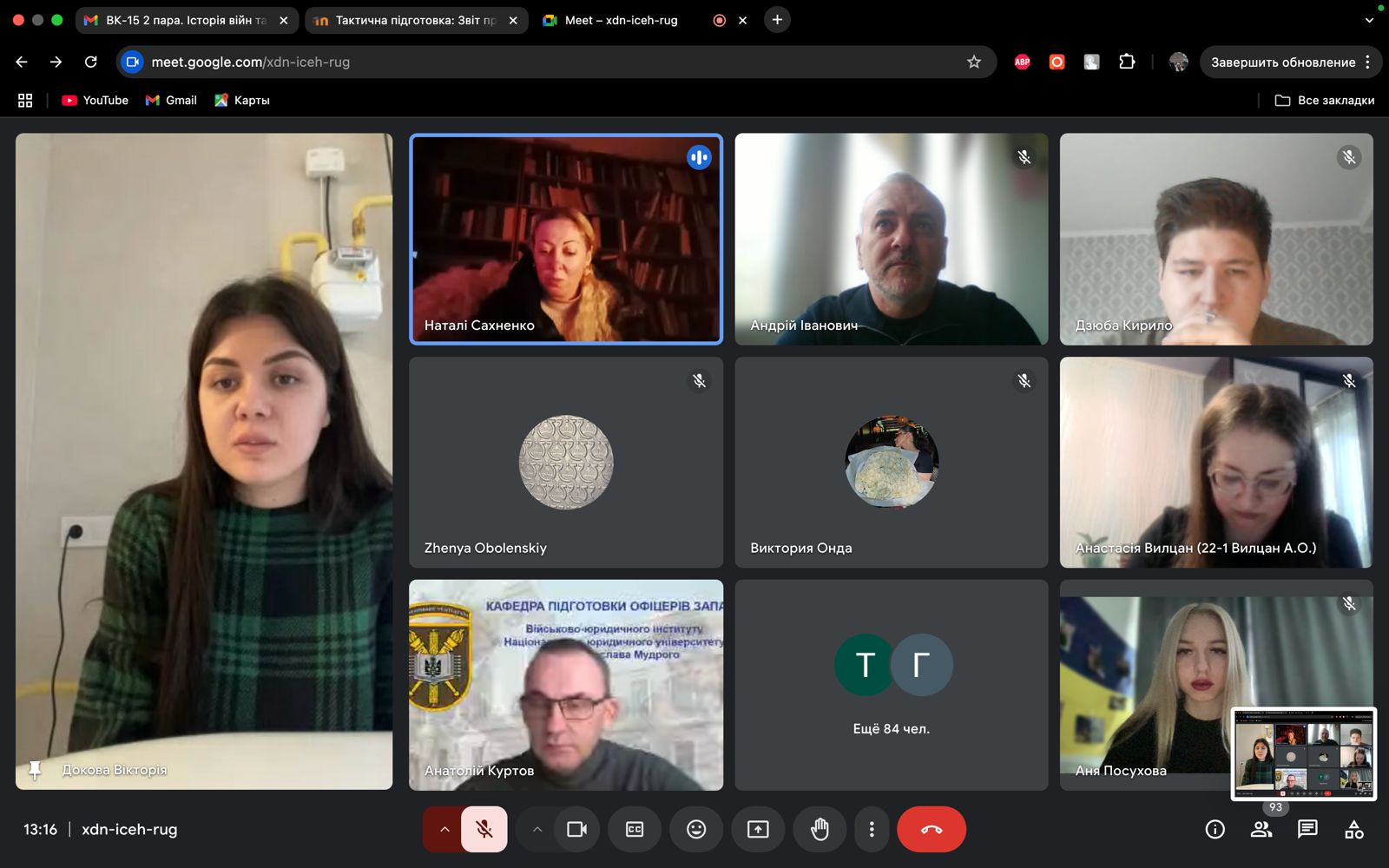 Модерував зустріч завідувач кафедри проф. Анатолій Куртов, а доповідачами виступили випускники кафедри, зокрема: Вікторія Докова – старший офіцер відділу організації правової роботи Департаменту юридичного забезпечення Міністерства оборони України, капітан юстиції; Микита Чикота – молодший лейтенант; Дар’я Соларьова – адвокат з військового права, молодший лейтенант; Маріанна Бочагіна – молодший лейтенант; Анастасія Вилцан – заступниця декана факультету прокуратури, асистентка кафедри криміналістики, молодший лейтенант; Юлія Пасічна – Почесний працівник прокуратури України – старший радник юстиції; випускниця кафедри 2024 та випускниця Університету 1996, молодший лейтенант запасу.